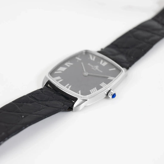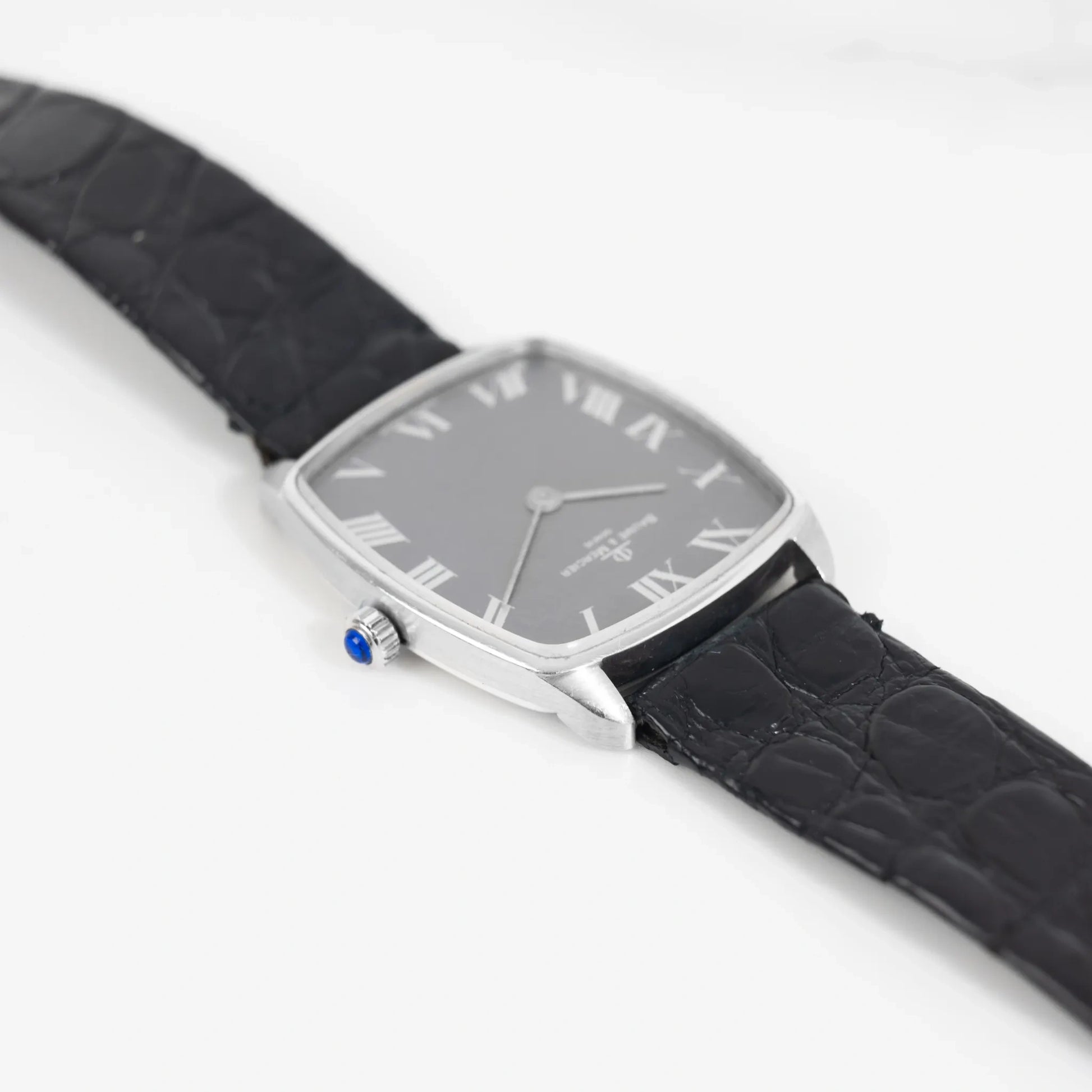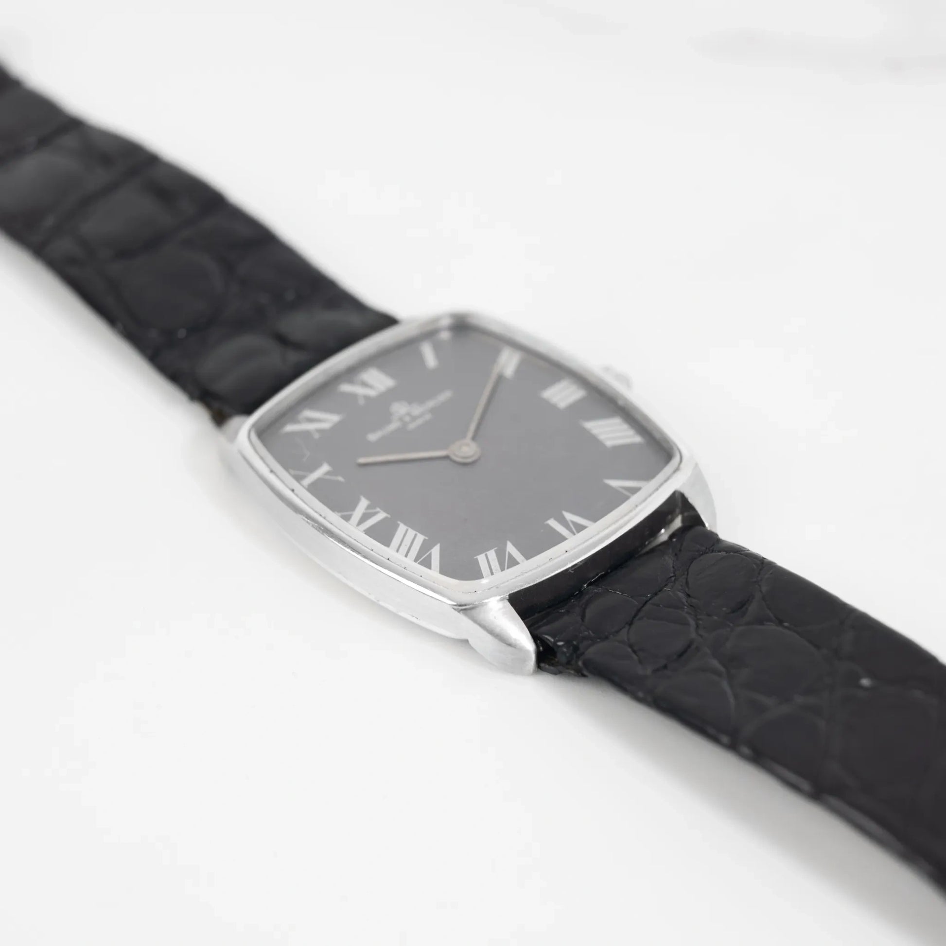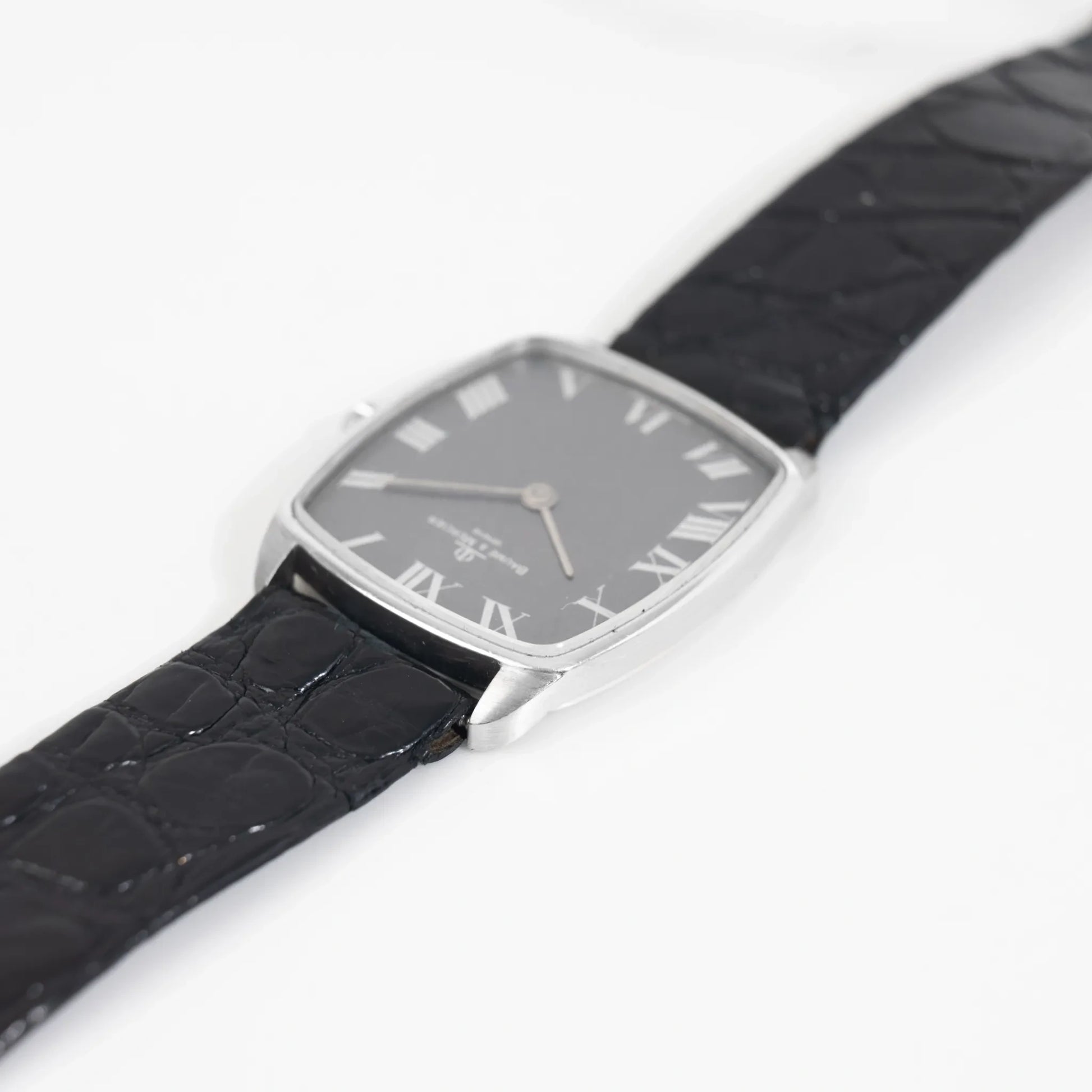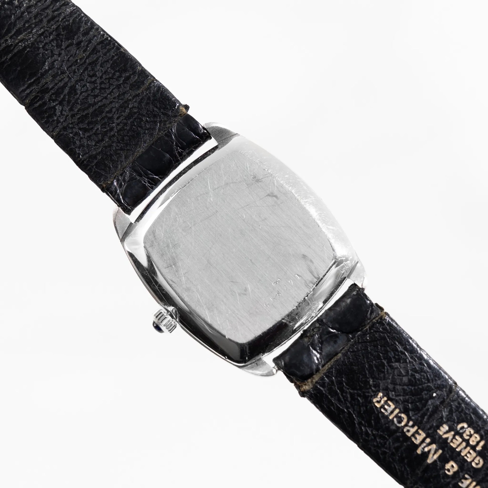 Dans les années 70, Baume & Mercier explore de nouvelles formes horlogères en rupture avec le classicisme des décennies précédentes. Parmi ces créations, la référence 37060 se distingue par son boîtier tonneau élancé, très représentatif de l’esthétique de cette époque : à la fois audacieuse et élégante.