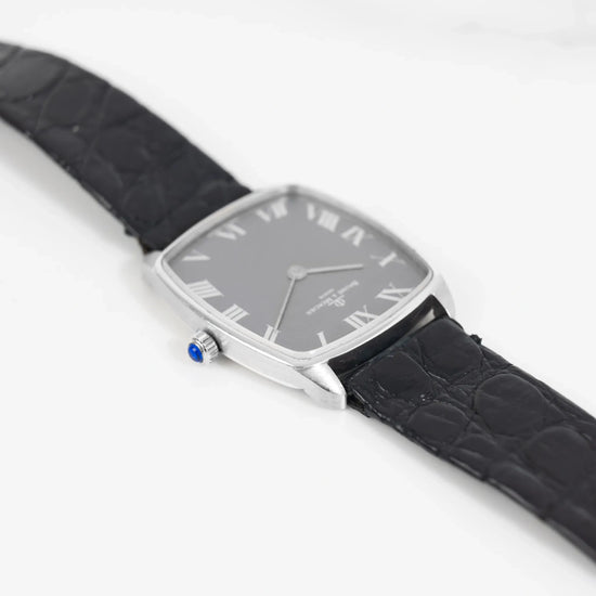 Ce modèle en or blanc, au cadran gris texturé façon lin, est un témoignage raffiné de ce design horloger singulier des seventies. Son allure chic et discrète, alliée à une taille contenue, en fait une montre unisexe, idéale pour les amateurs de vintage aux goûts affirmés.