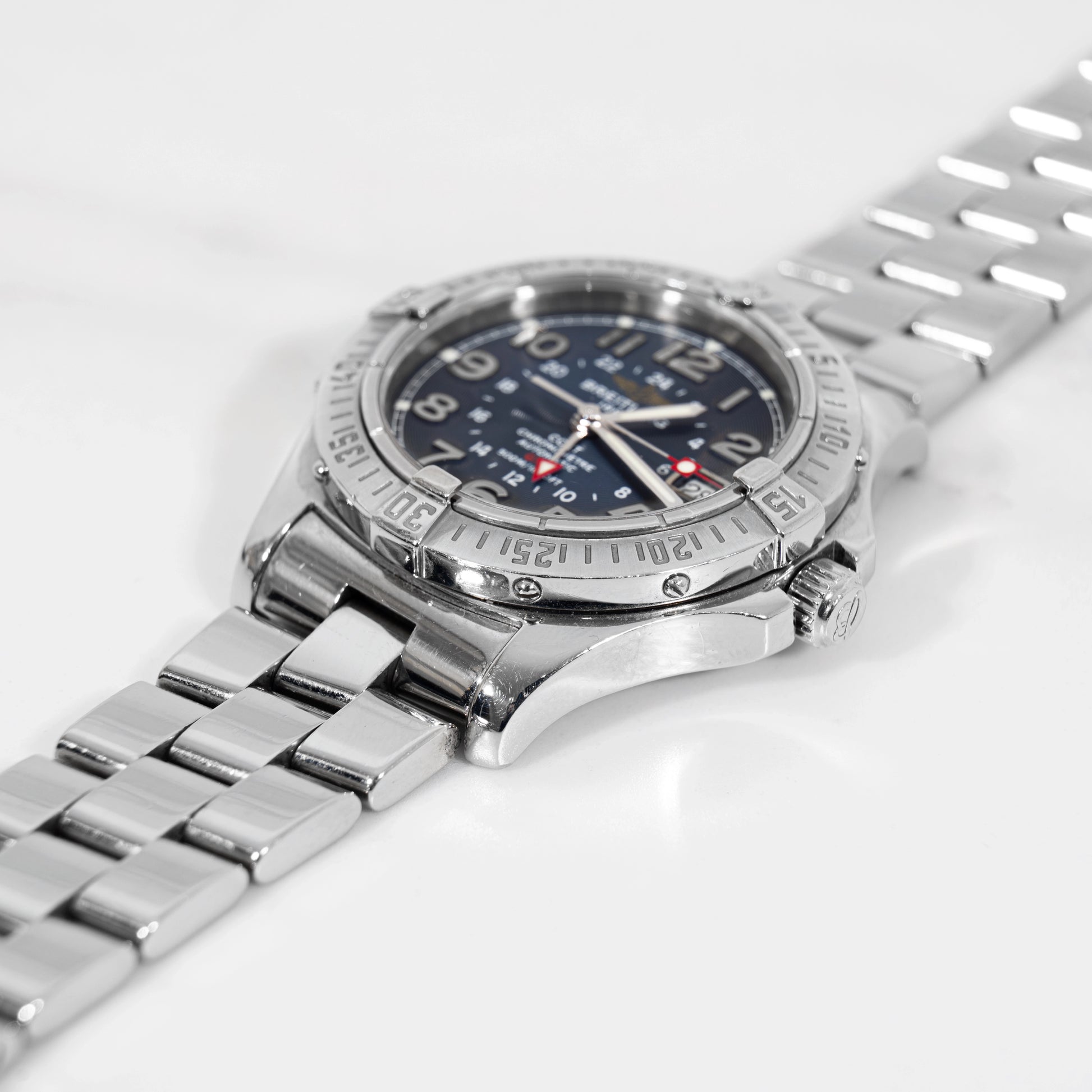 La collection « Colt GMT » de Breitling s’inscrit dans l’esprit des montres d’aviateur et de plongée, en combinant lisibilité, robustesse et élégance. Cette référence A32350 (produite de 2005 à 2008 notamment) est dotée d’un mouvement automatique avec fonction GMT, ce qui la rend particulièrement polyvalente pour qui recherche une montre sport‑chic qui suit plusieurs fuseaux horaires.