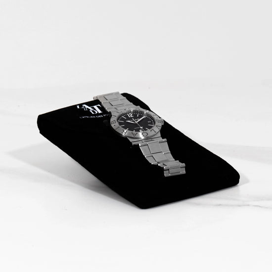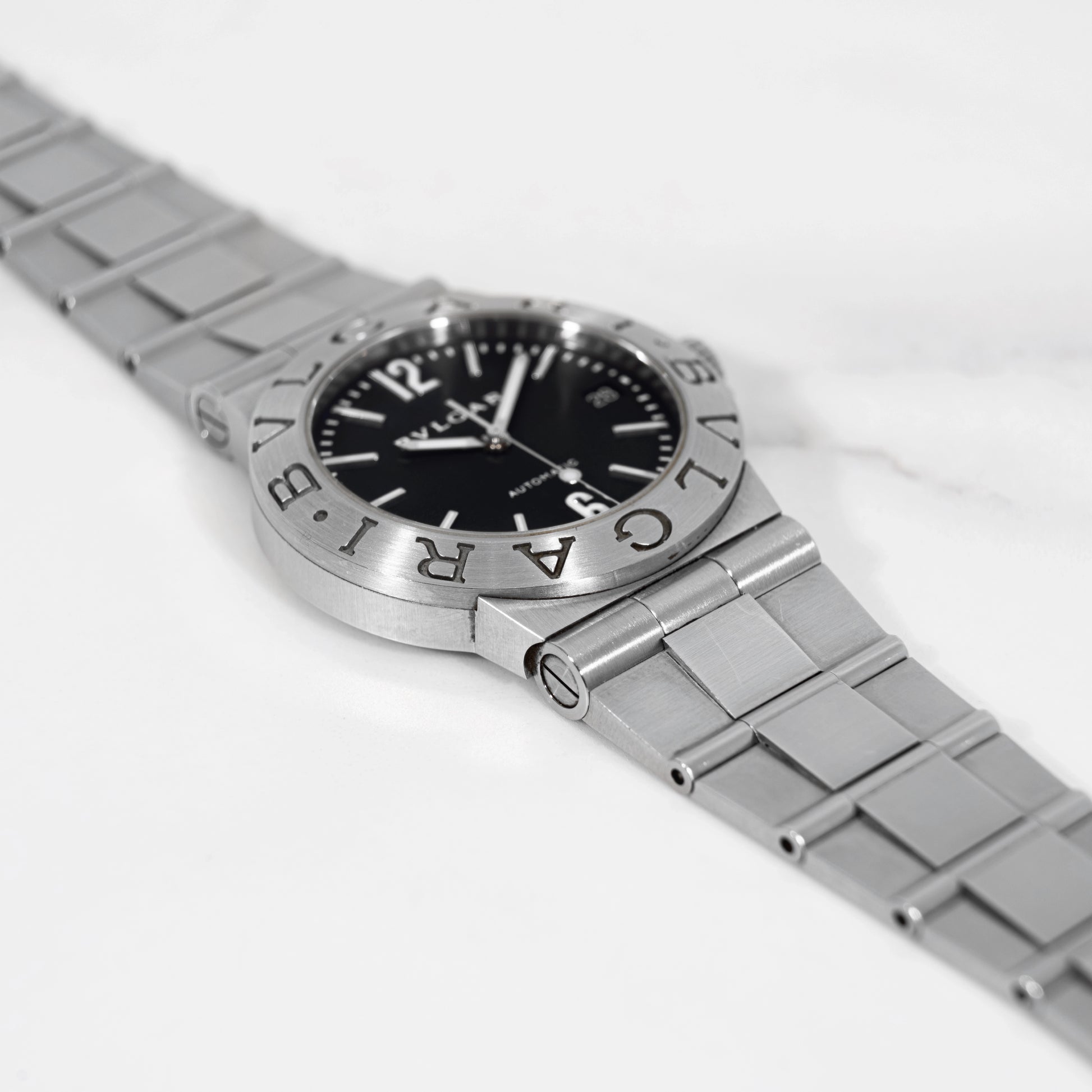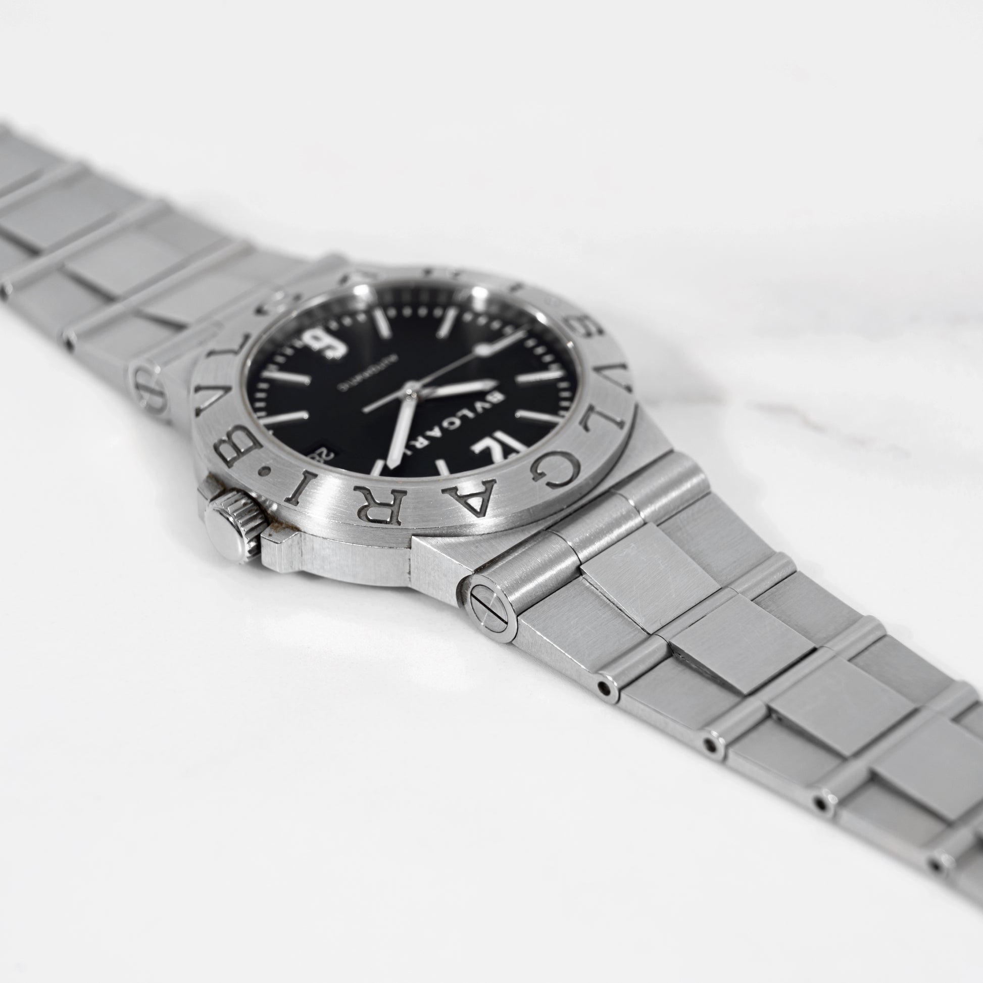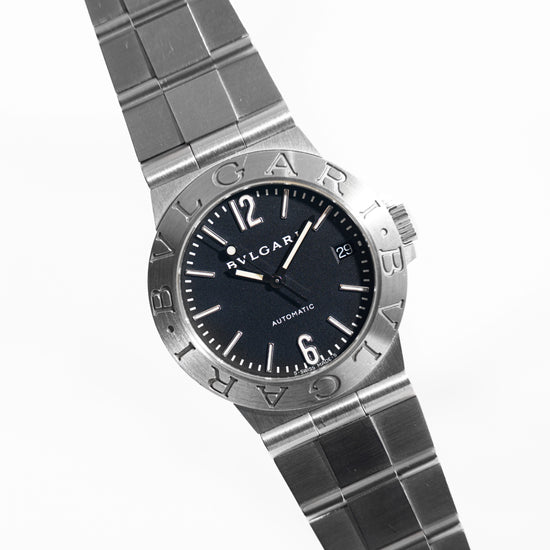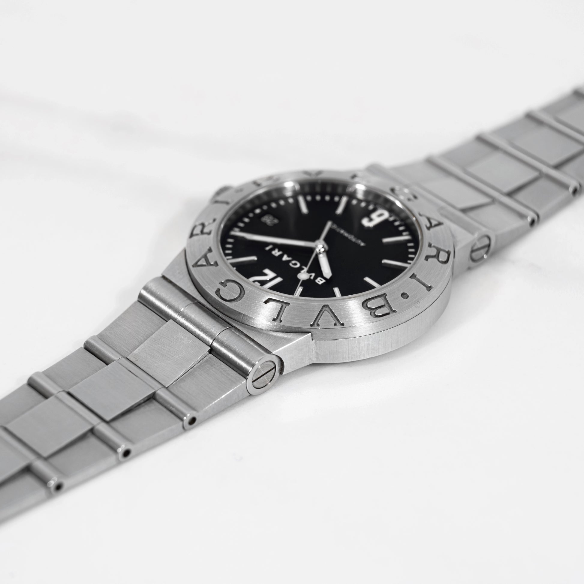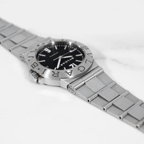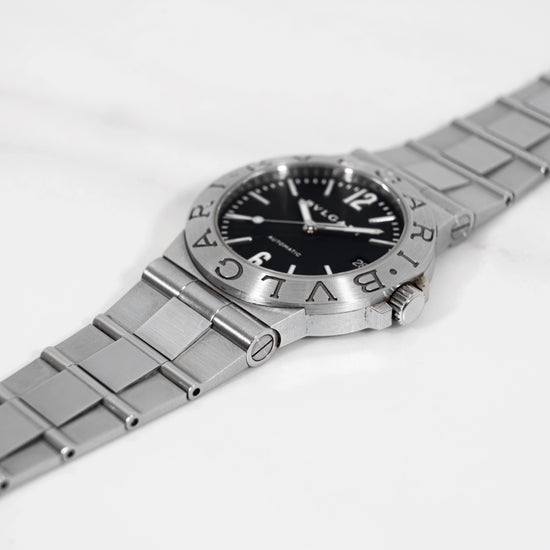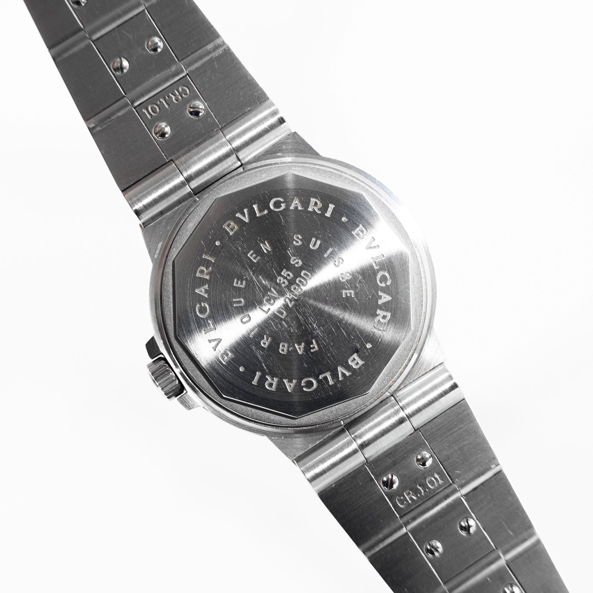 La collection Diagono de Bvlgari fait partie des lignes sport‑chic contemporaines de la marque, mêlant savoir‑faire horloger suisse et esthétique italienne raffinée. Le modèle LCV 35 S, lancé vers la fin des années 1990 / début 2000, se distingue par son boîtier acier de 35 mm, son cadran noir et sa configuration automatique simple mais élégante avec sa trotteuse lolipop. Il incarne un style urbain, discret mais affirmé.