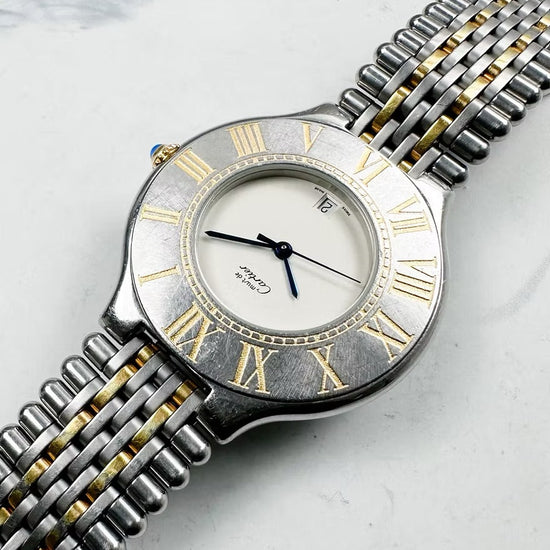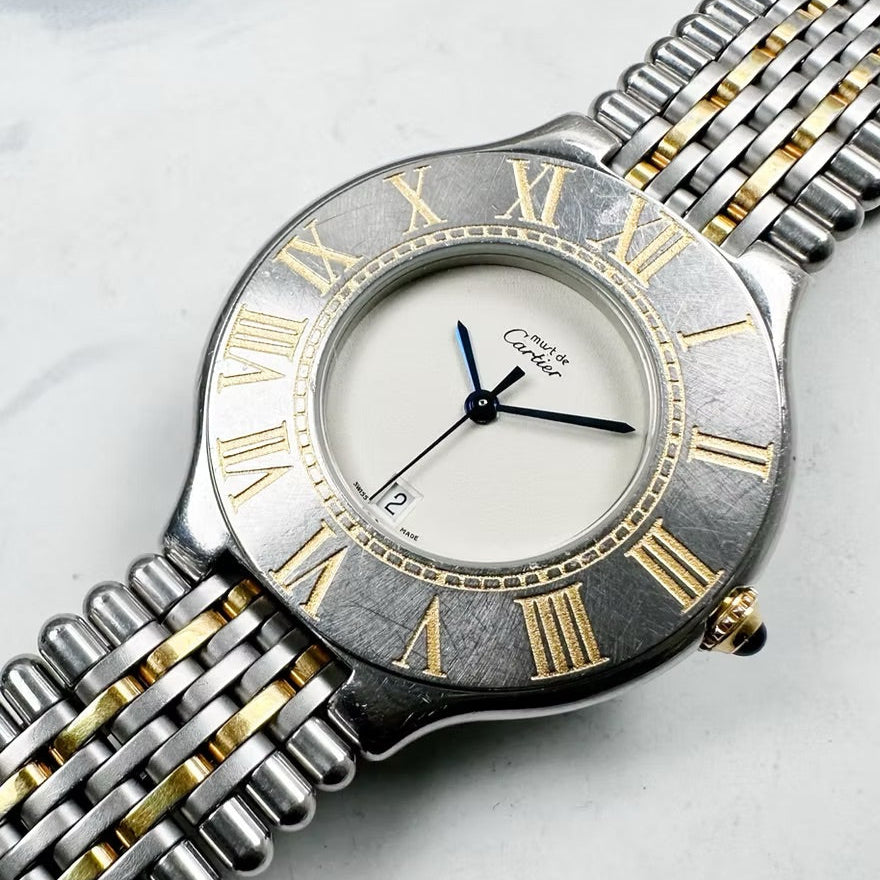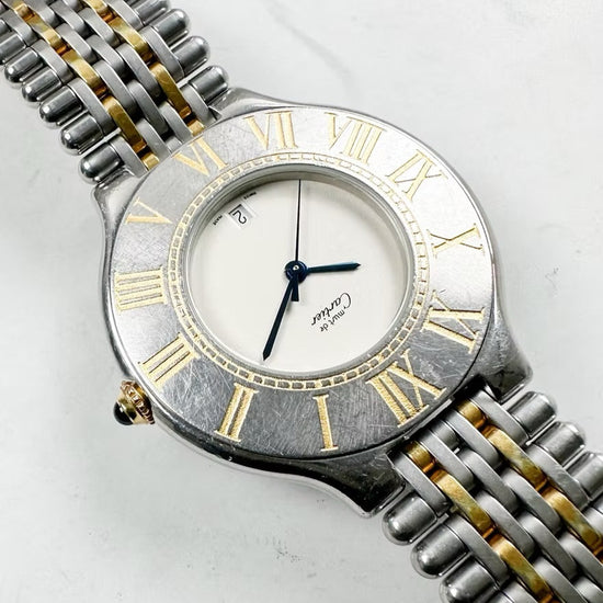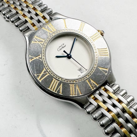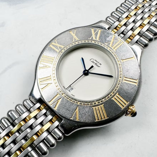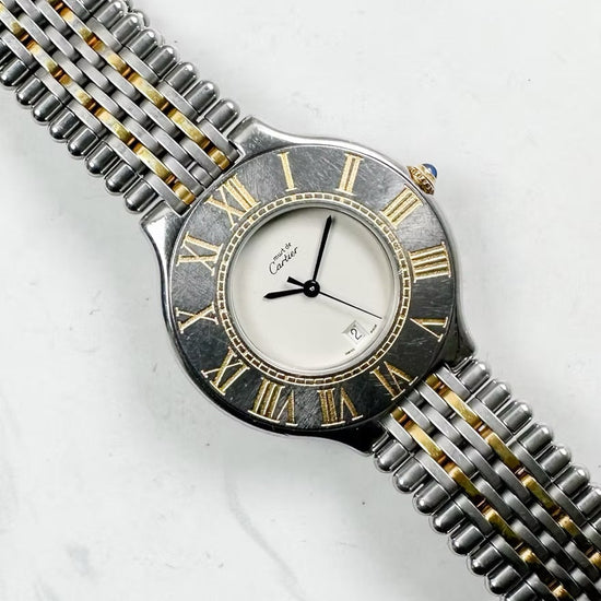 Icône des années 1980, la Must de Cartier 21 s’inscrit dans la lignée des créations néo-classiques de la maison parisienne. Sa lunette lisse gravée de chiffres romains sur fond acier brossé, son boîtier galbé et son bracelet intégré lui confèrent une silhouette immédiatement reconnaissable.