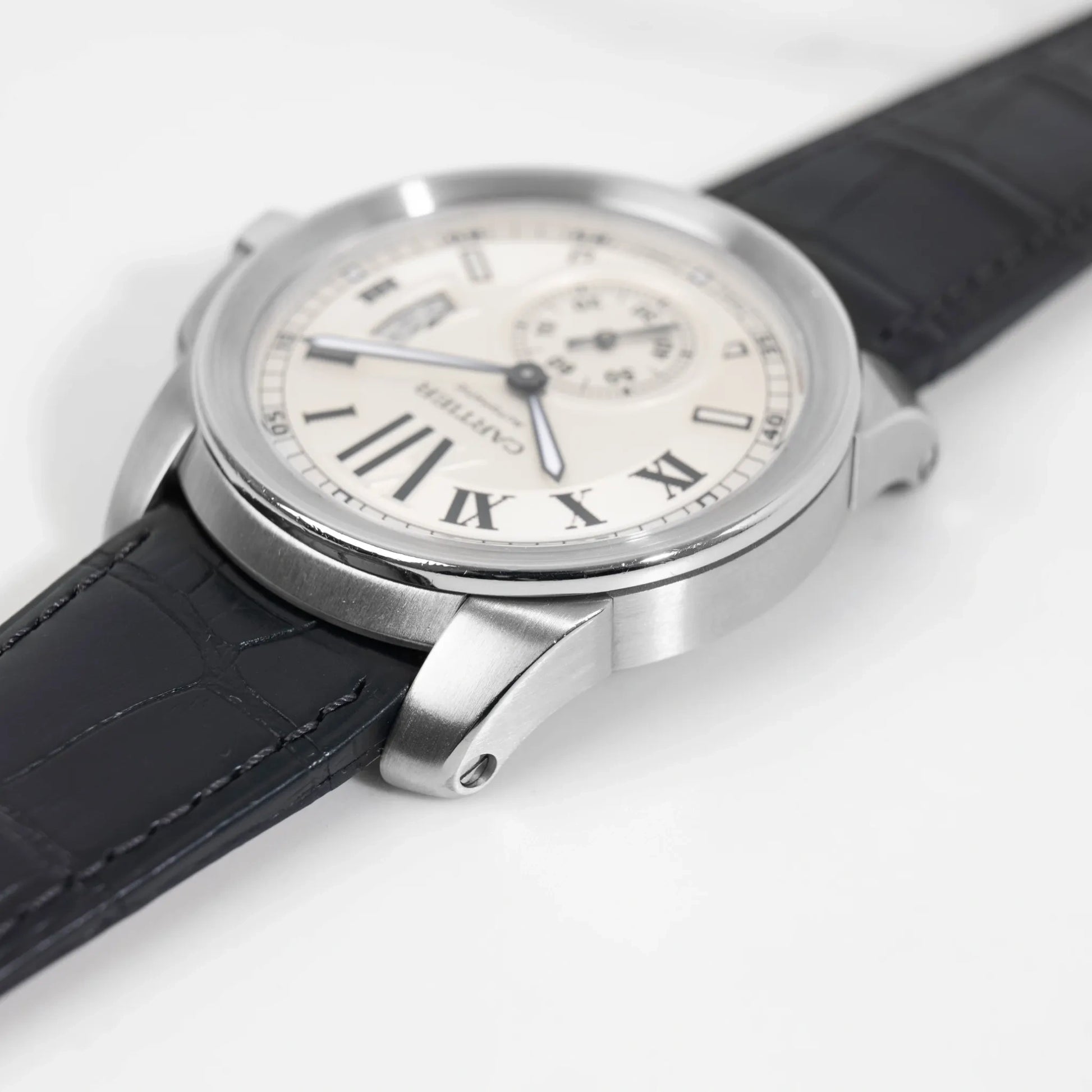 • Cadran : Blanc, chiffres romains noirs, petite seconde à 6h, date à 3h