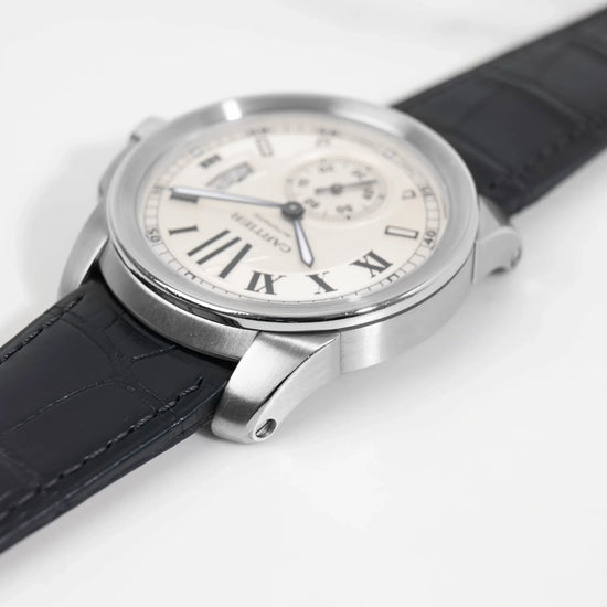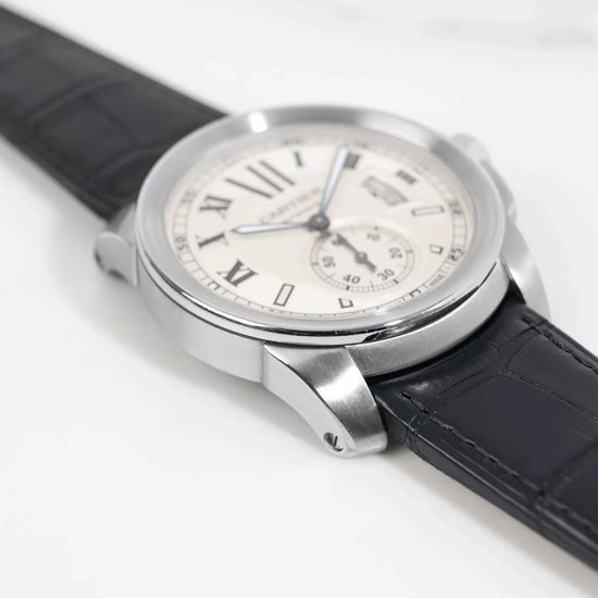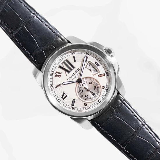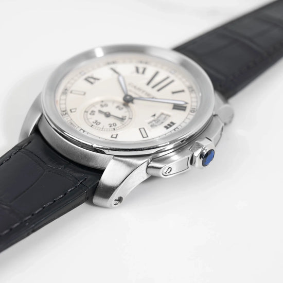 Lancée dans les années 2010, la collection Cartier Calibre marque une volonté de la maison de proposer une montre à l’allure plus masculine et sportive, tout en conservant les codes de raffinement propres à Cartier. La ligne se distingue par un boîtier puissant, une lunette finement travaillée, et une signature visuelle forte, notamment grâce à ses chiffres romains stylisés et sa petite seconde à 6h.