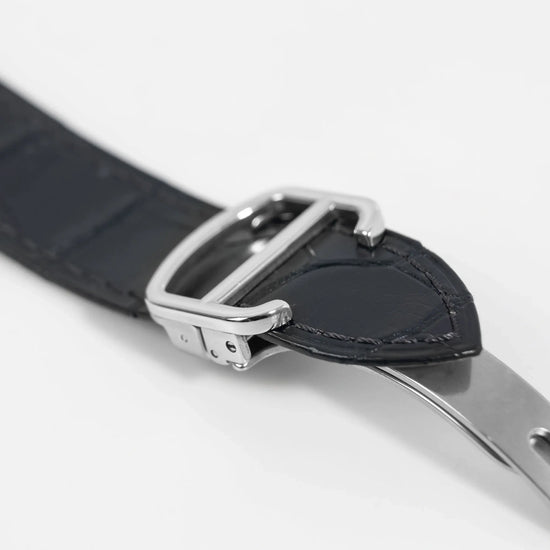 • Bracelet : Cuir noir Cartier, boucle déployante acier siglée
