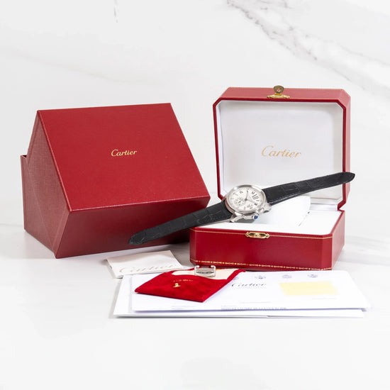 La référence 3389, avec son cadran blanc lumineux, son mouvement automatique et sa carrure imposante, est un bel équilibre entre sportivité et élégance. L’exemplaire proposé ici bénéficie d’une révision complète Cartier effectuée en octobre 2024 et n’a jamais été portée depuis : une condition exceptionnelle pour un modèle déjà discontinué.