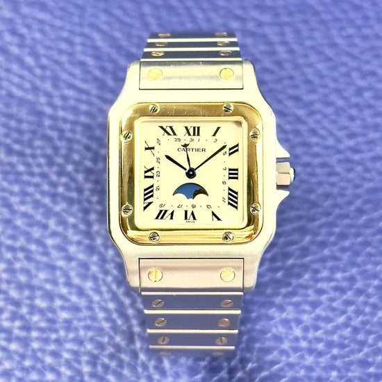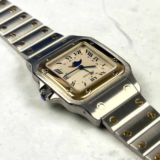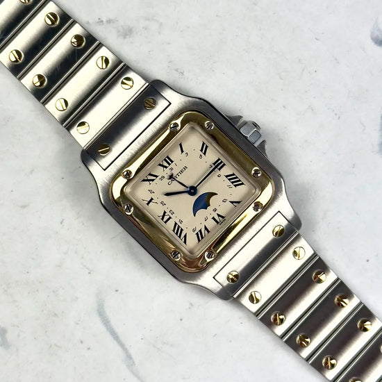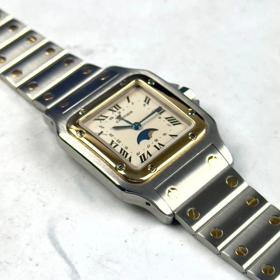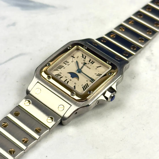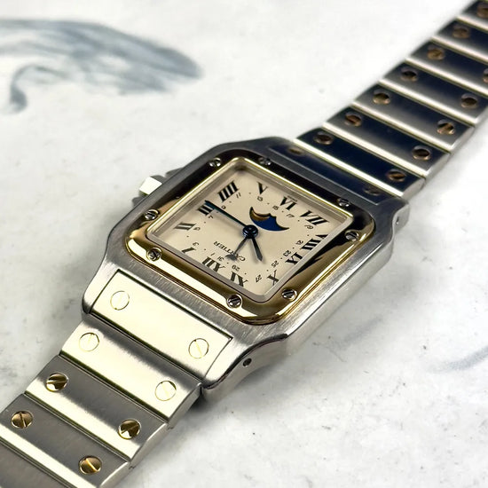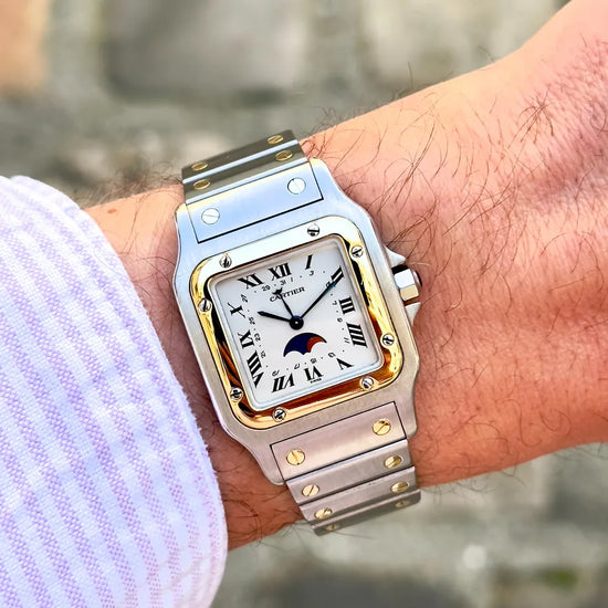 La Santos Galbée Phase de Lune est une Cartier à part, rare et élégante, qui séduira les amateurs de montres habillées avec une vraie signature horlogère. La complication lunaire, parfaitement intégrée au cadran classique, en fait une montre de goût, de détails, et de distinction. Un choix raffiné pour celles et ceux qui cherchent plus qu'une Santos : une Santos qui se démarque.