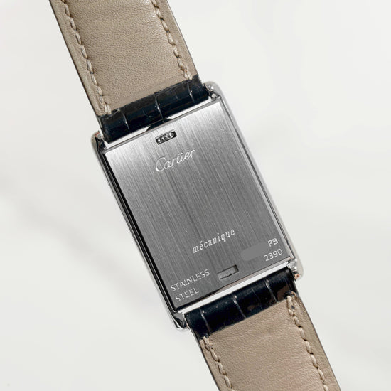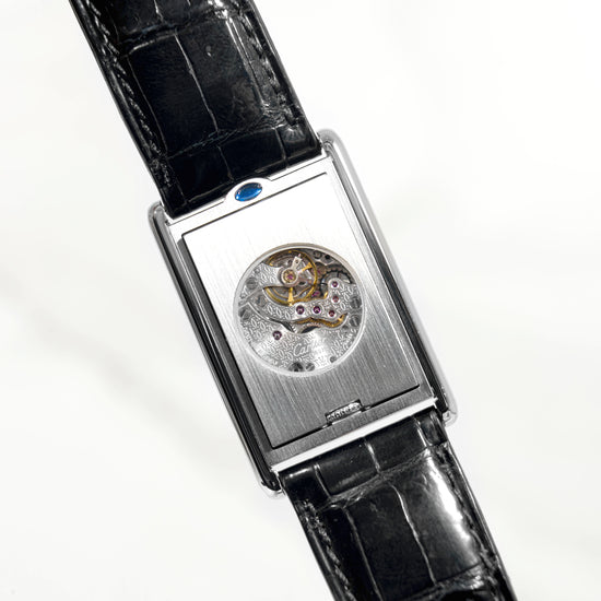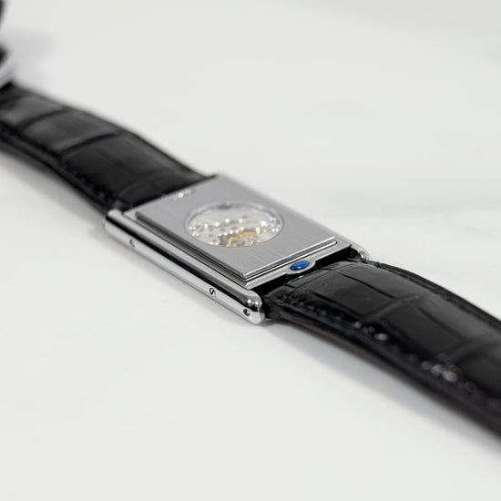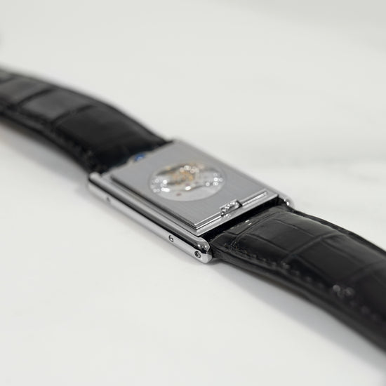 La Tank Basculante de Cartier est une déclinaison originale de la Tank : son boîtier pivotant permet de « basculer » le cadran vers l’arrière, offrant à la fois protection et élégance. La réf. 2390, produite autour du début des années 2000, combine ce mécanisme élégant à une finition contemporaine. Le modèle ici proposé se distingue par un fond de boîte transparent (rare sur cette génération), offrant une vue directe sur le mouvement.