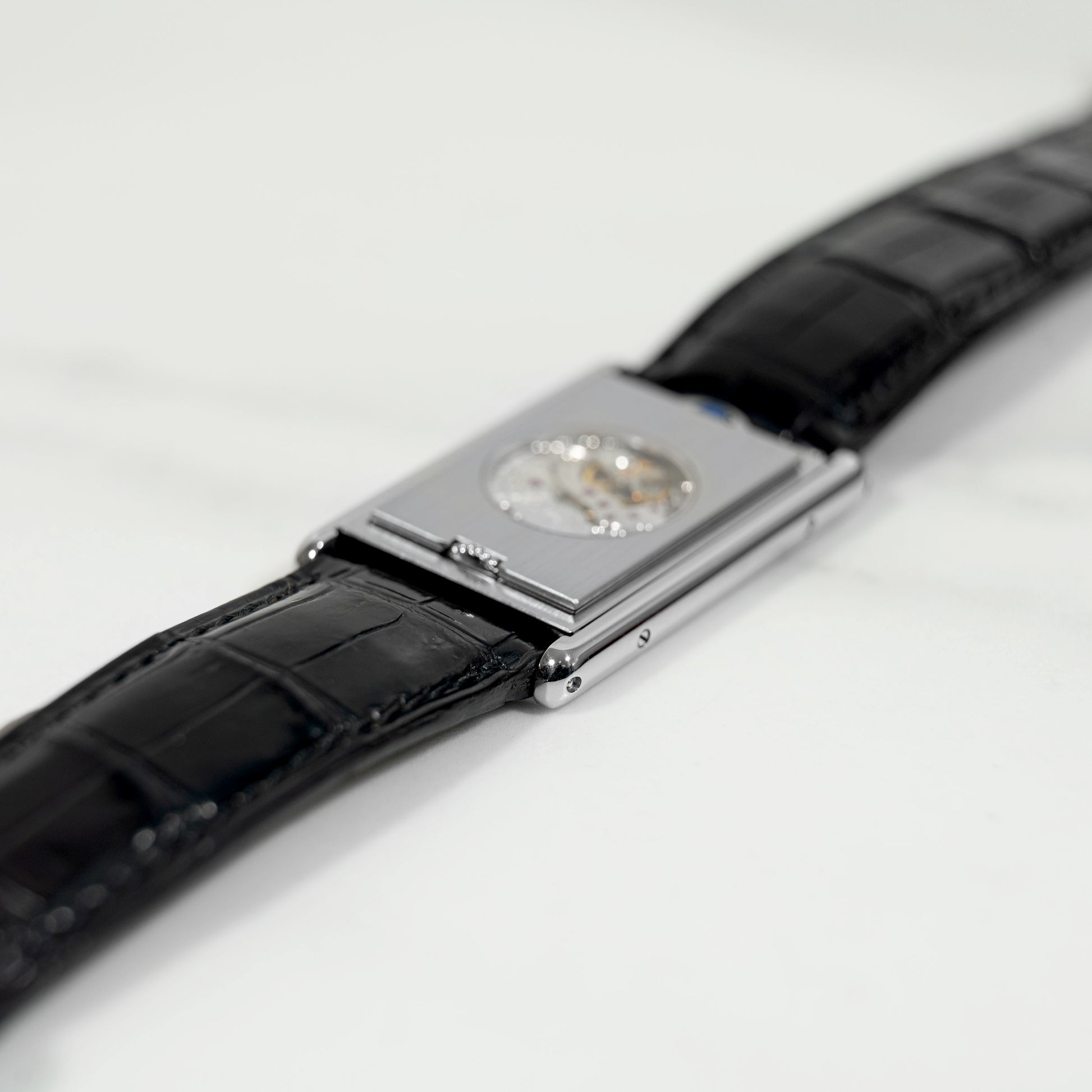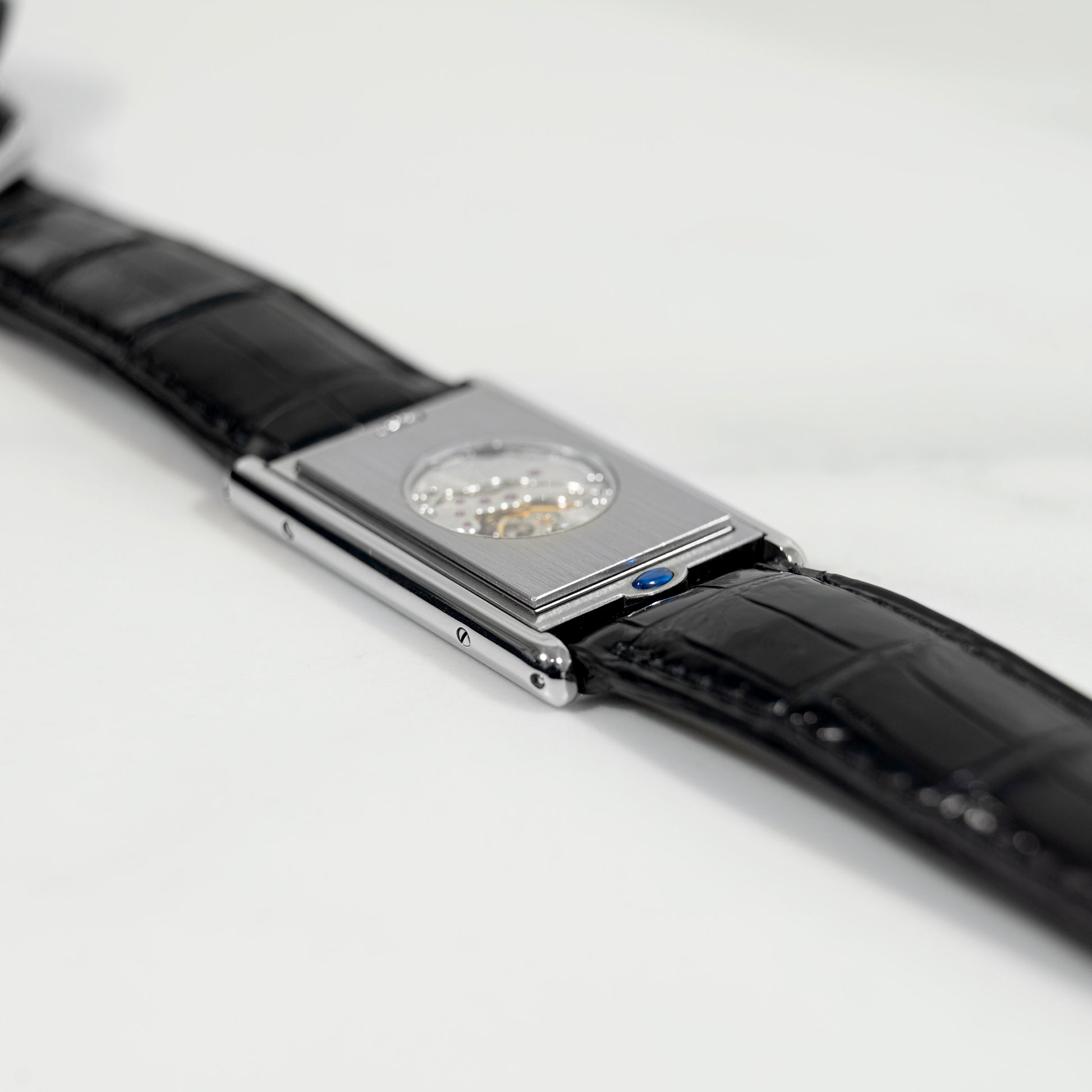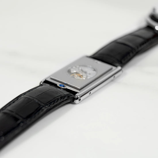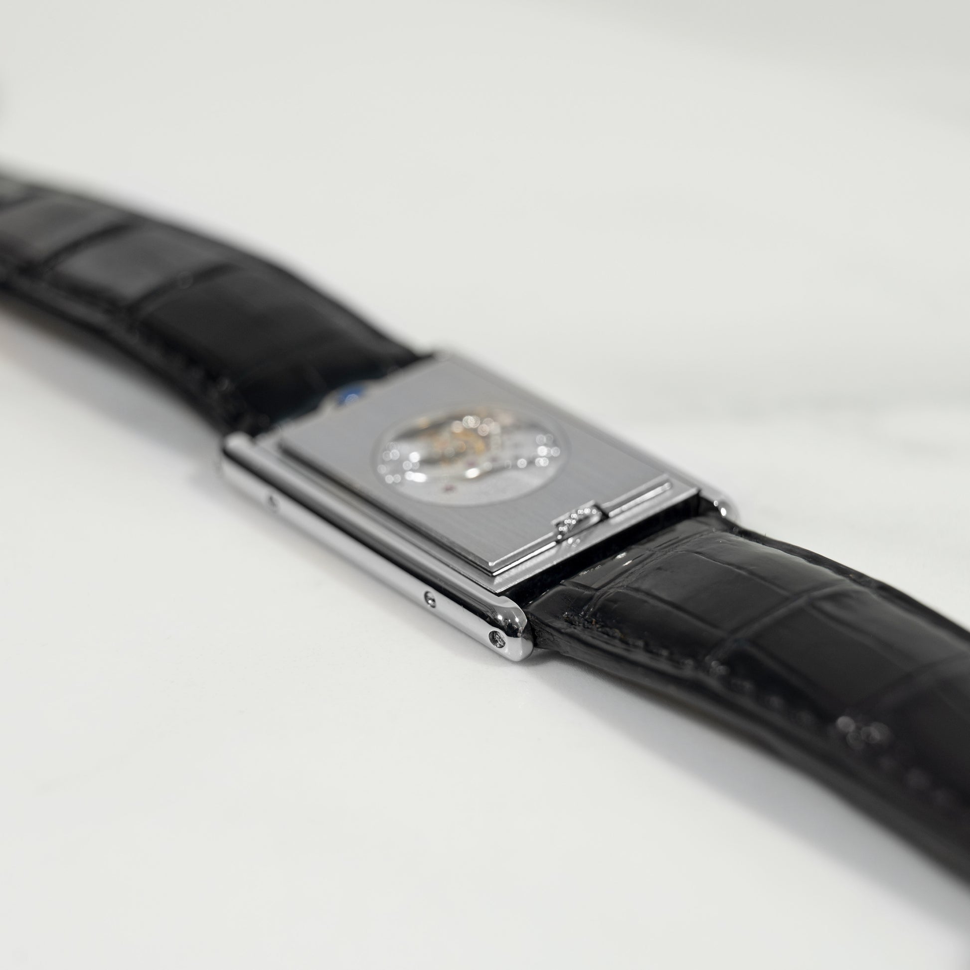 Cette Tank Basculante réf. 2390 est une pièce empreinte d’élégance horlogère « à la Cartier » : raffinée, avec un boîtier réversible unique, et ici dotée d’un fond transparent — une caractéristique rare qui valorise mécaniquement et esthétiquement la pièce. Le format contenu et les finitions de qualité en font une montre d’exception pour amateurs éclairés, alliant originalité et sophistication.