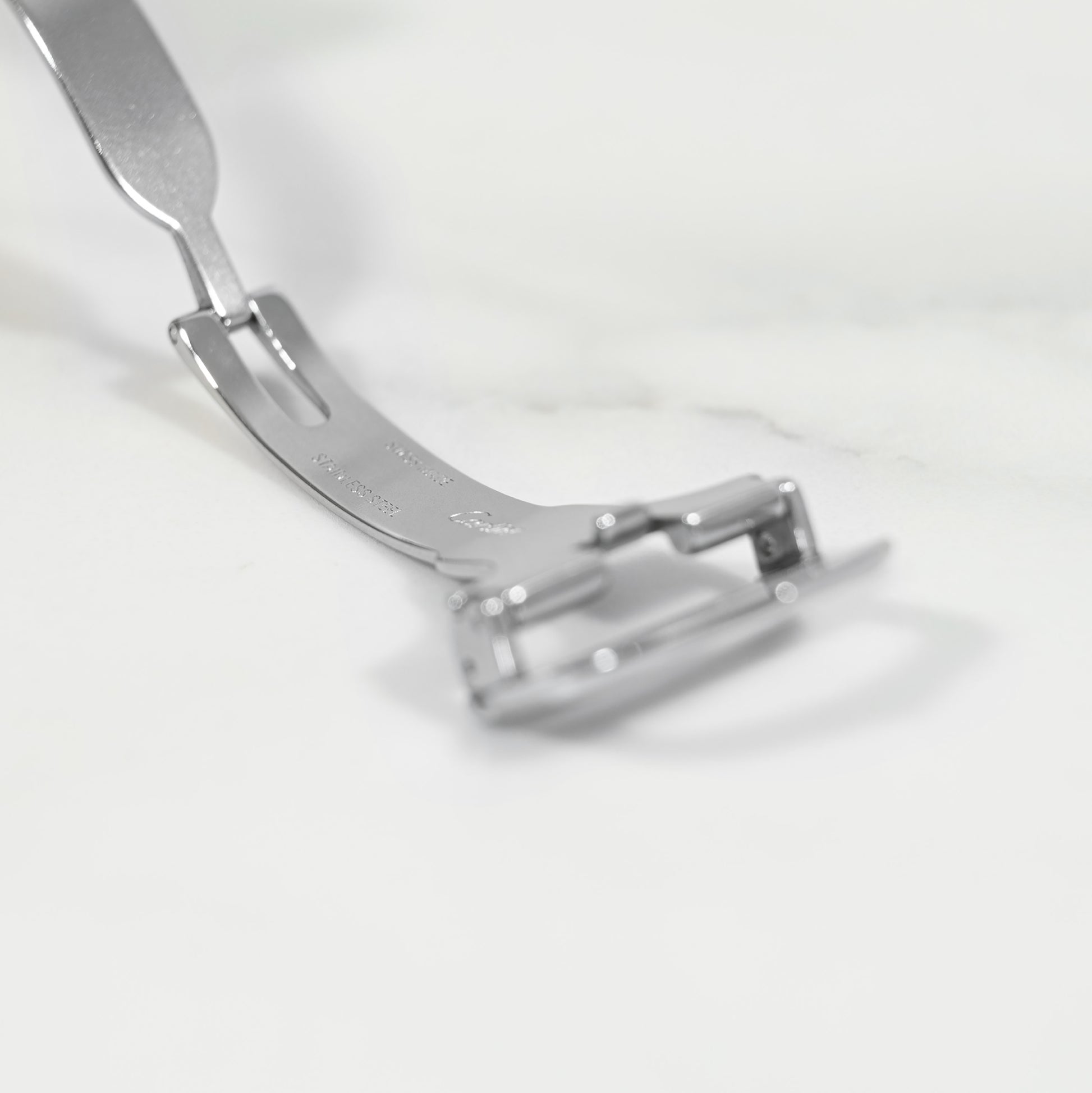 • Cadran : Blanc/argenté guilloché, chiffres romains noirs, aiguilles bleues