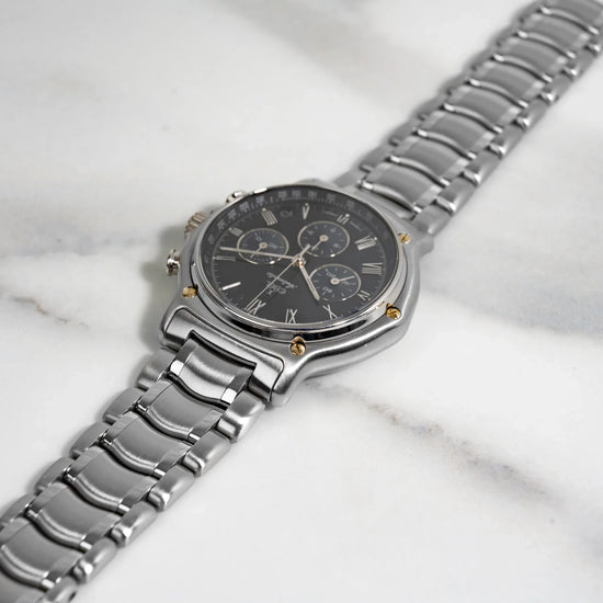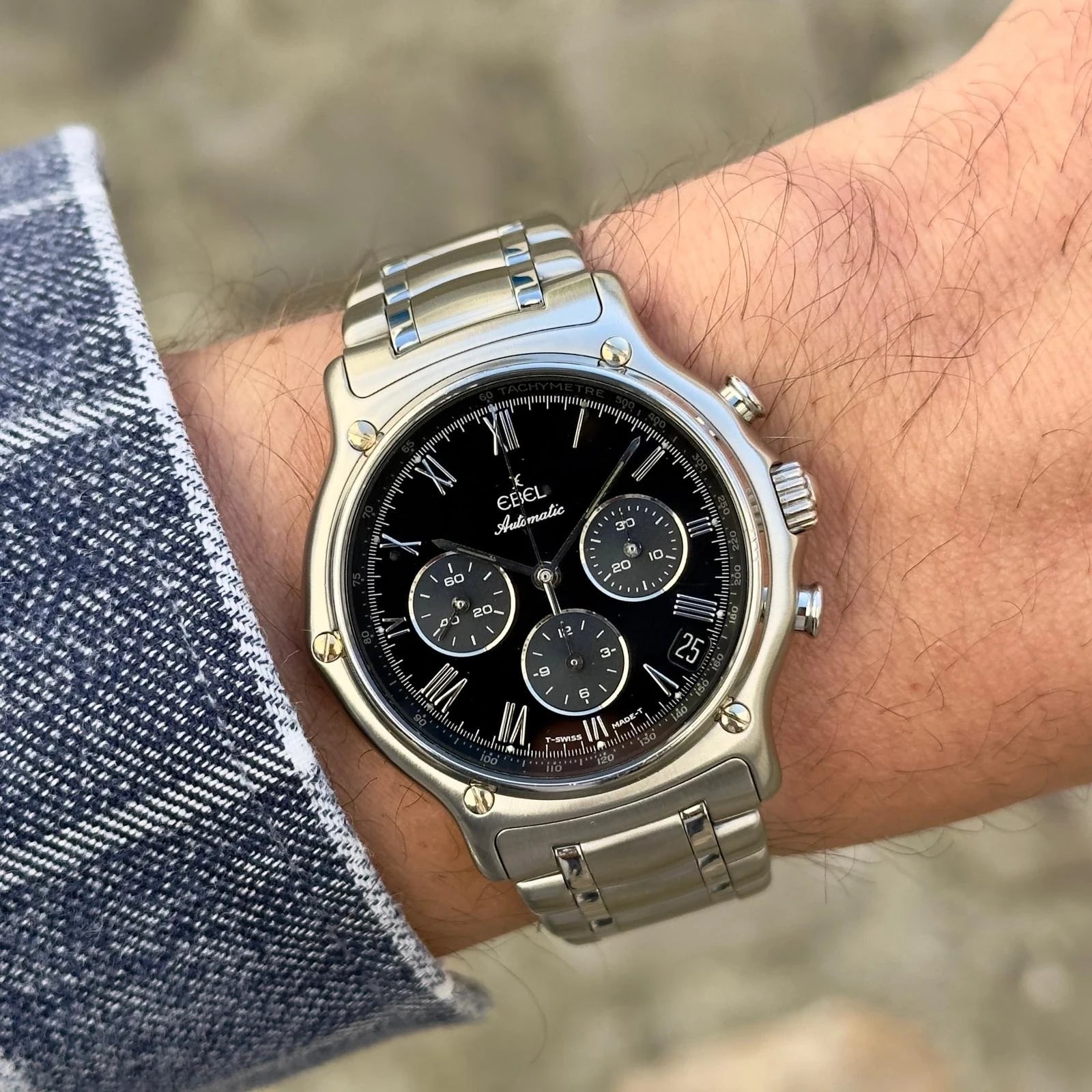 Le modèle 1911 se distingue par son boîtier au design fluide et ergonomique, des lignes galbées typiques d’Ebel, et une construction intégrée avec bracelet acier sculpté. Le tout sublimé ici par un cadran noir laqué profond, sobre et racé. Une montre sous-cotée et très convoitée, souvent surnommée "le chronographe discret du connaisseur".