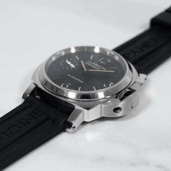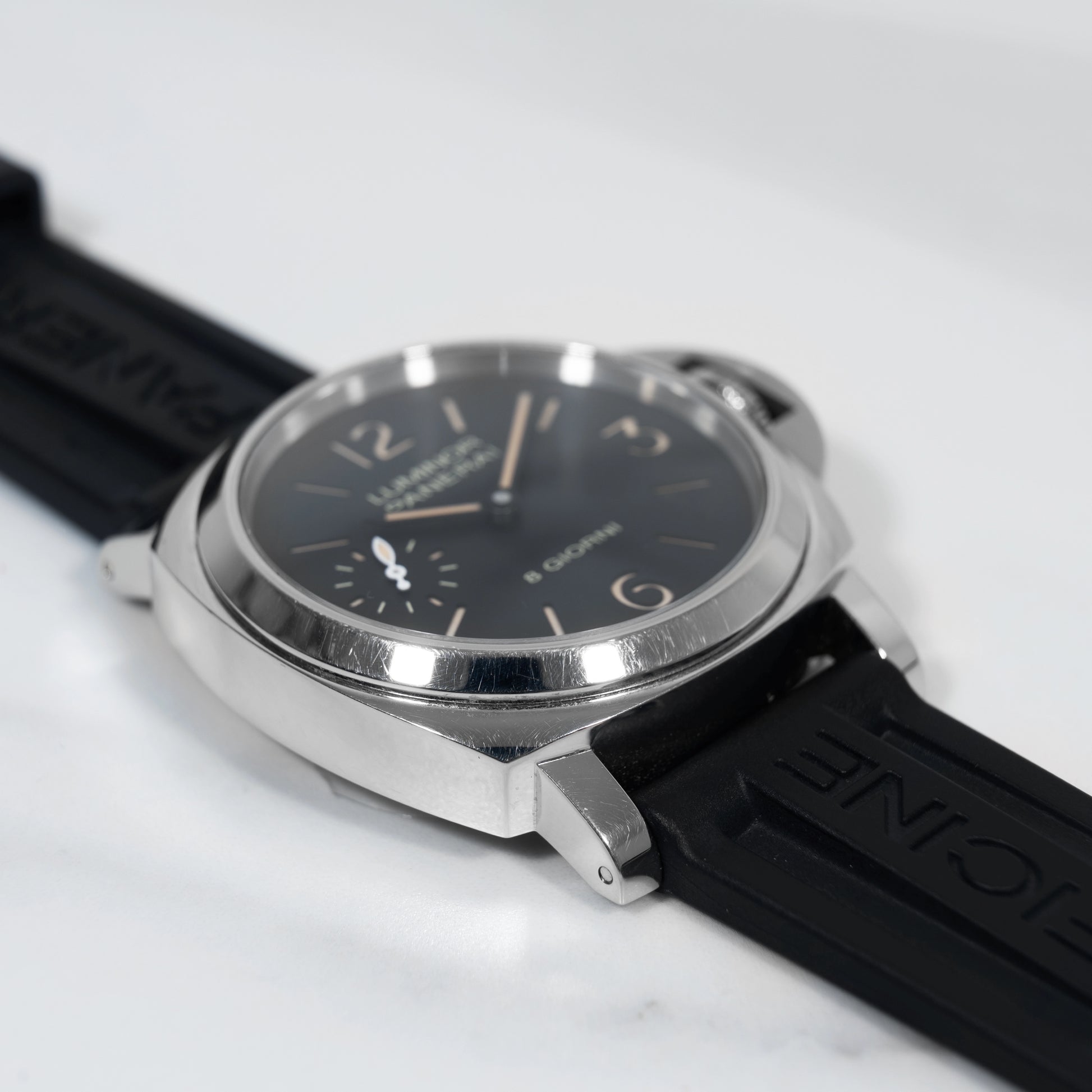 La collection Luminor de Panerai est immédiatement identifiable grâce à son boîtier coussin et son pont de protection de couronne caractéristique. Le modèle « 8 Giorni » met en avant une forte autonomie : un mouvement à remontage manuel capable de fonctionner pendant 8 jours sans être remonté. Le modèle PAM00915 s’inscrit dans cette lignée, en proposant une exécution contemporaine alliée à une forte personnalité.