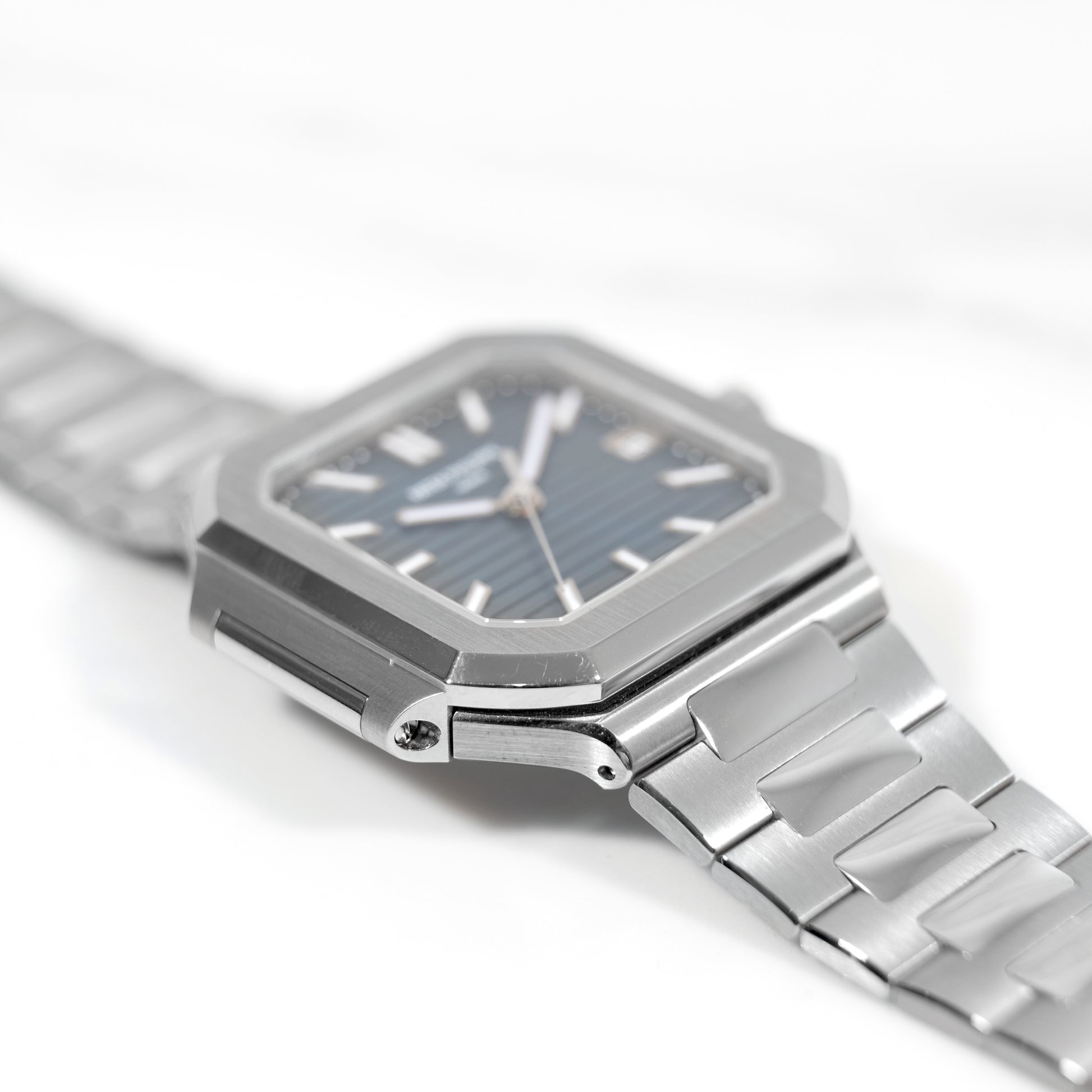 • Cadran : Bleu‑gris soleillé à motif embossé horizontal, index appliqués or blanc luminescents
