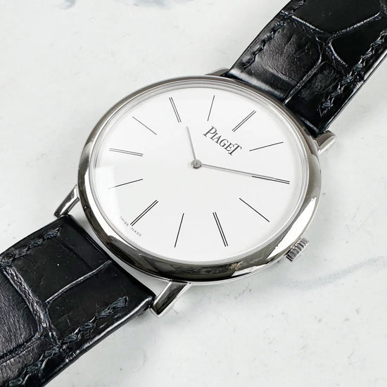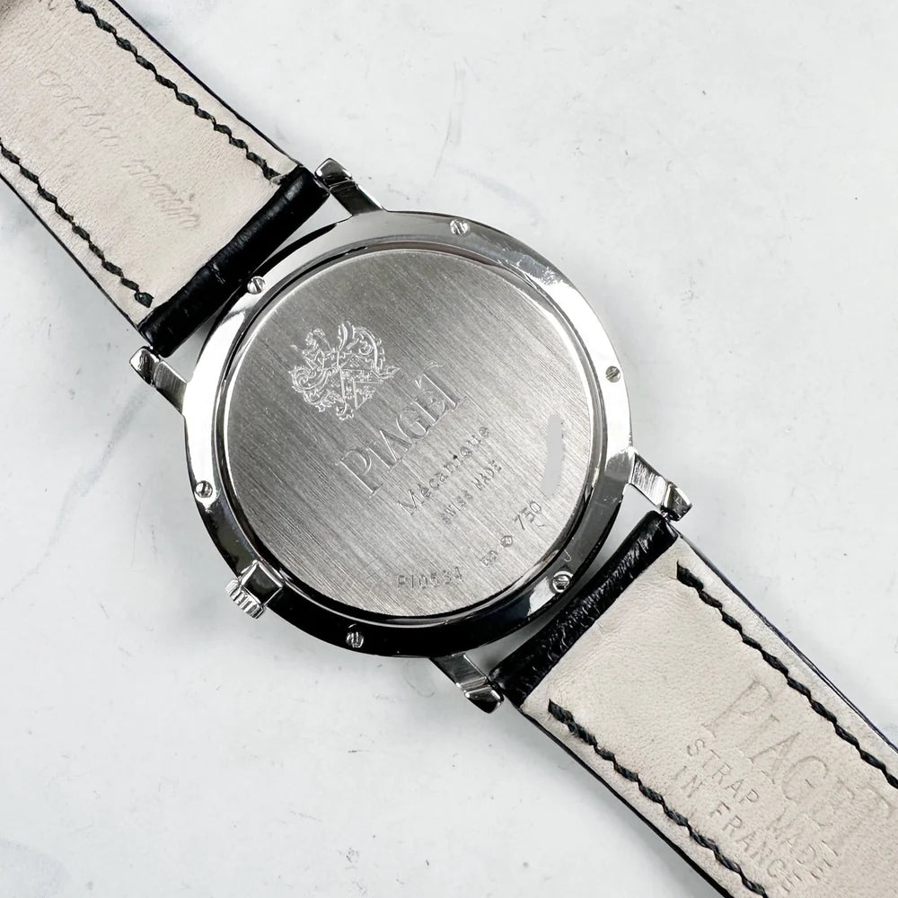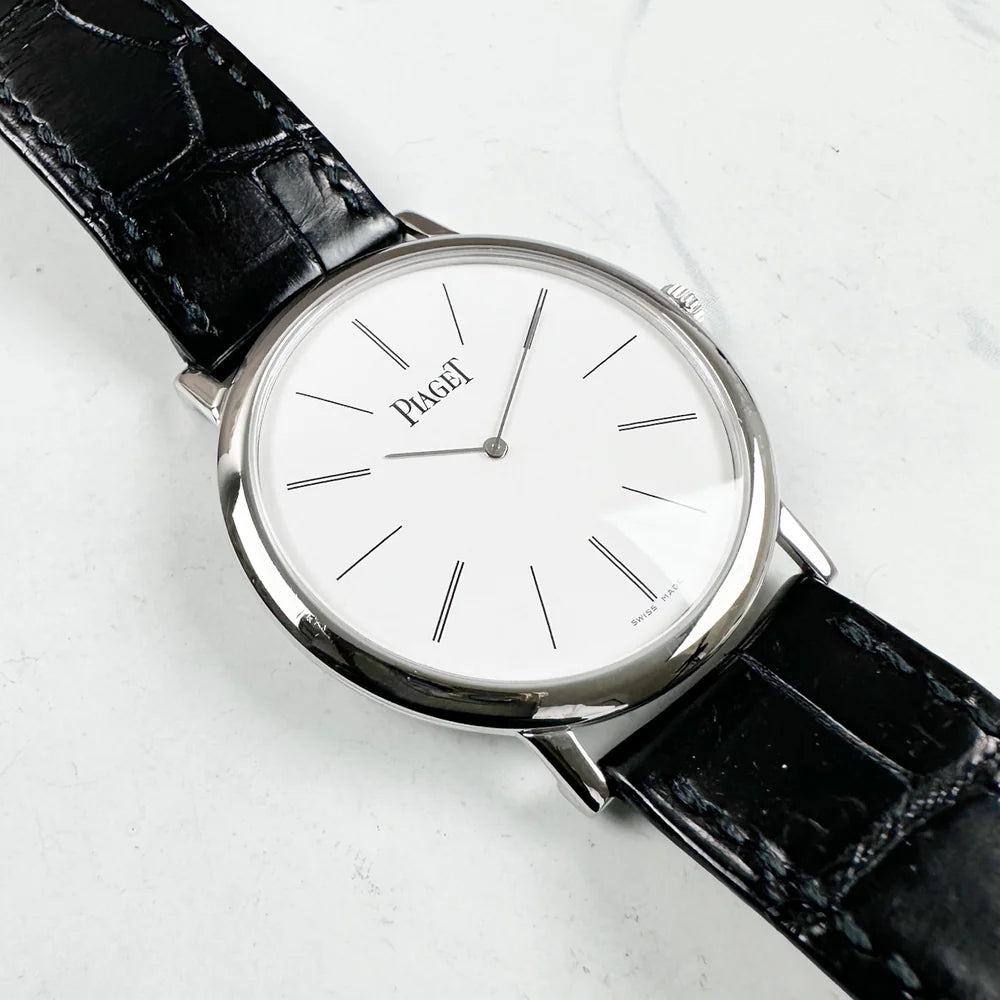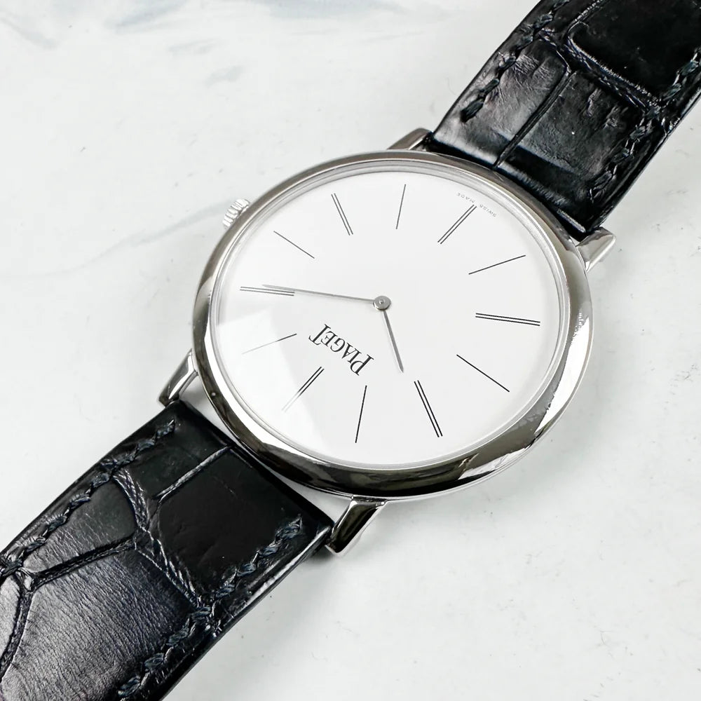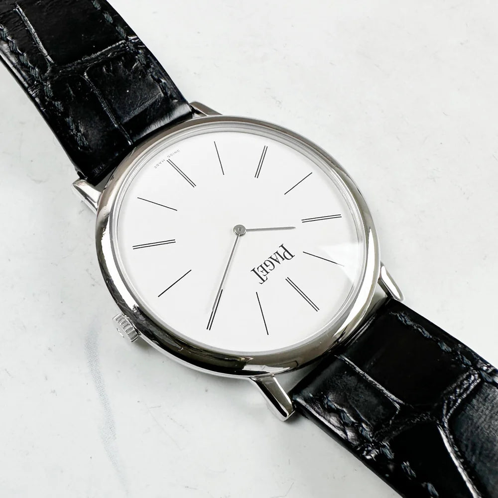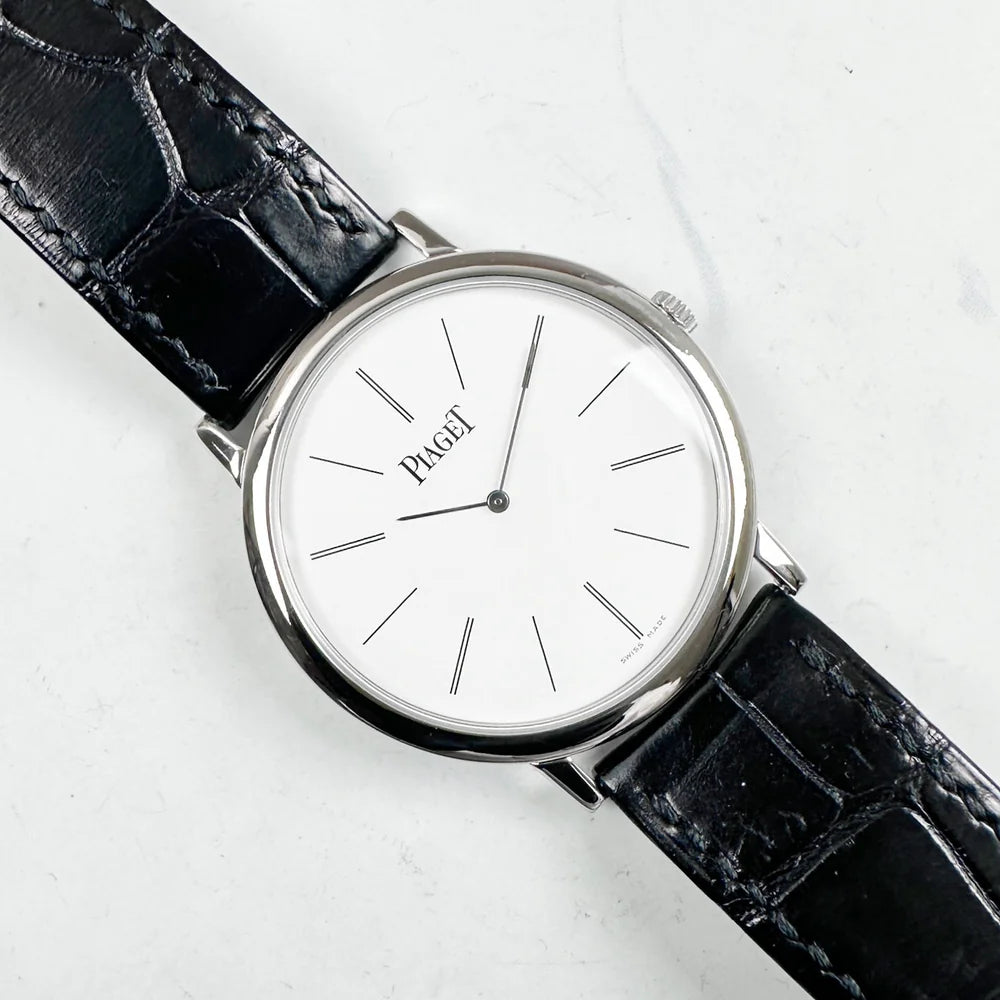 La collection Altiplano de Piaget incarne la maîtrise horlogère de la maison : ultra‑plate, élégante, minimaliste. Le modèle réf. P10584 reprend ces codes avec raffinement, dans un diamètre de 38 mm et un boîtier en or blanc. Une montre de belle facture, aussi bien pour une tenue habillée que pour un usage quotidien maîtrisé.