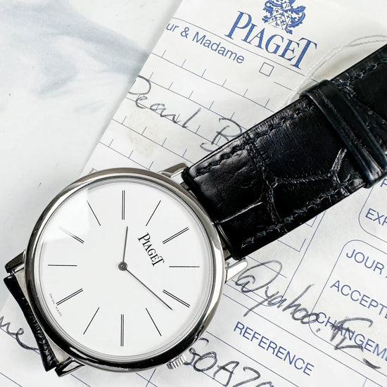 Cette Altiplano P10584 est une montre d’exception pour qui recherche une pièce discrète mais chargée d’élégance. Le boîtier en or blanc, le calibre manuel finement travaillé, le diamètre contenu : tout est pensé pour la sobriété et le raffinement. Le fait qu’elle soit accompagnée d’une facture d’achat de 2008 lui donne une traçabilité appréciable. Une belle opportunité pour un amateur de montres habillées d’horlogerie fine.