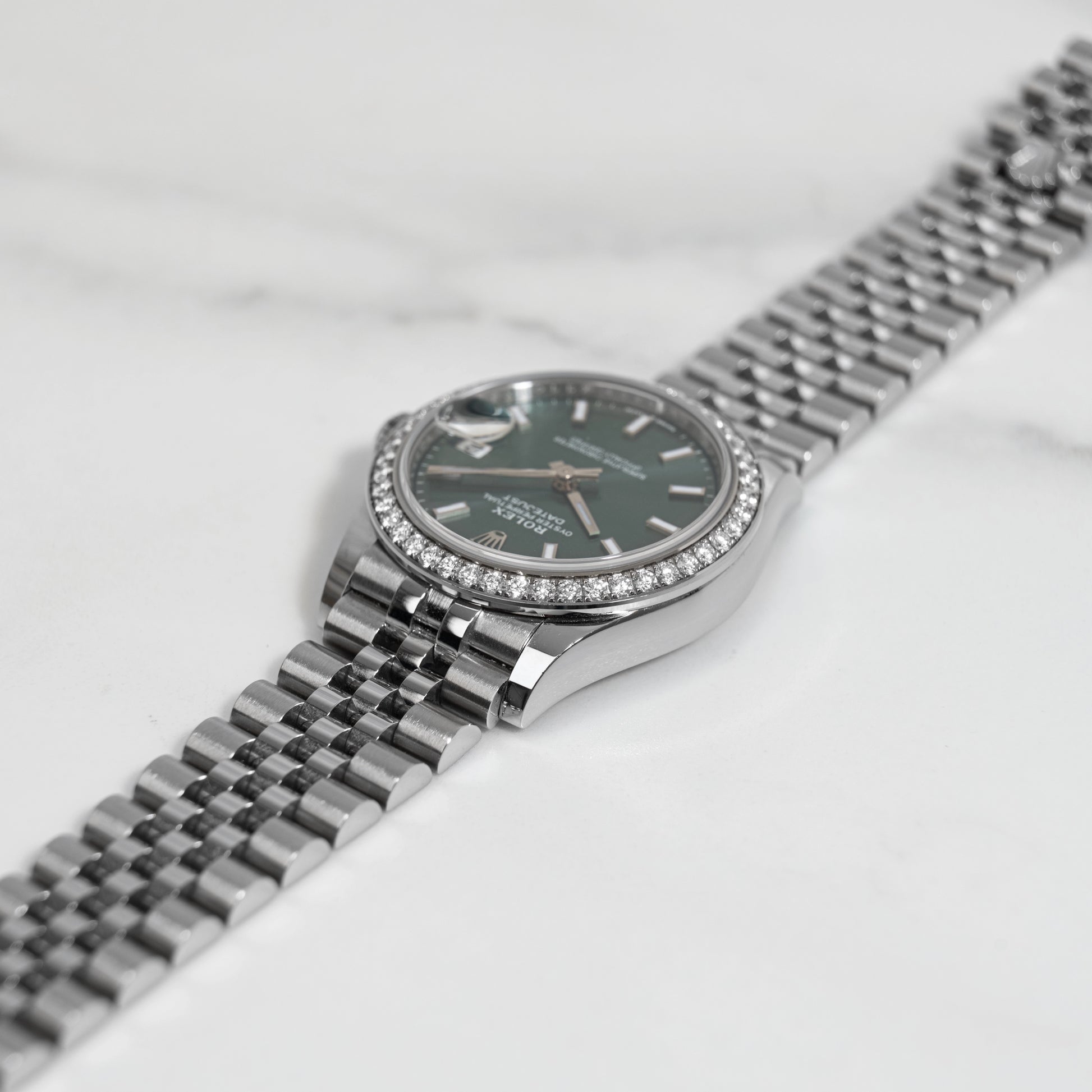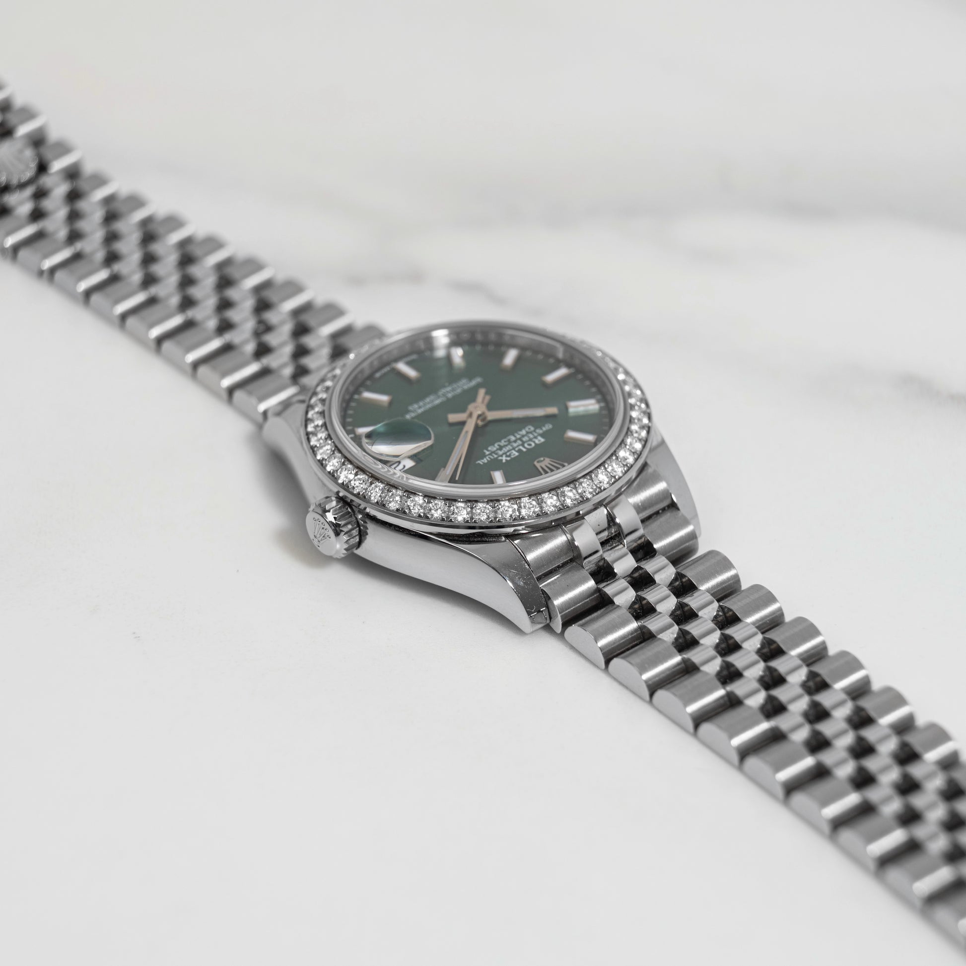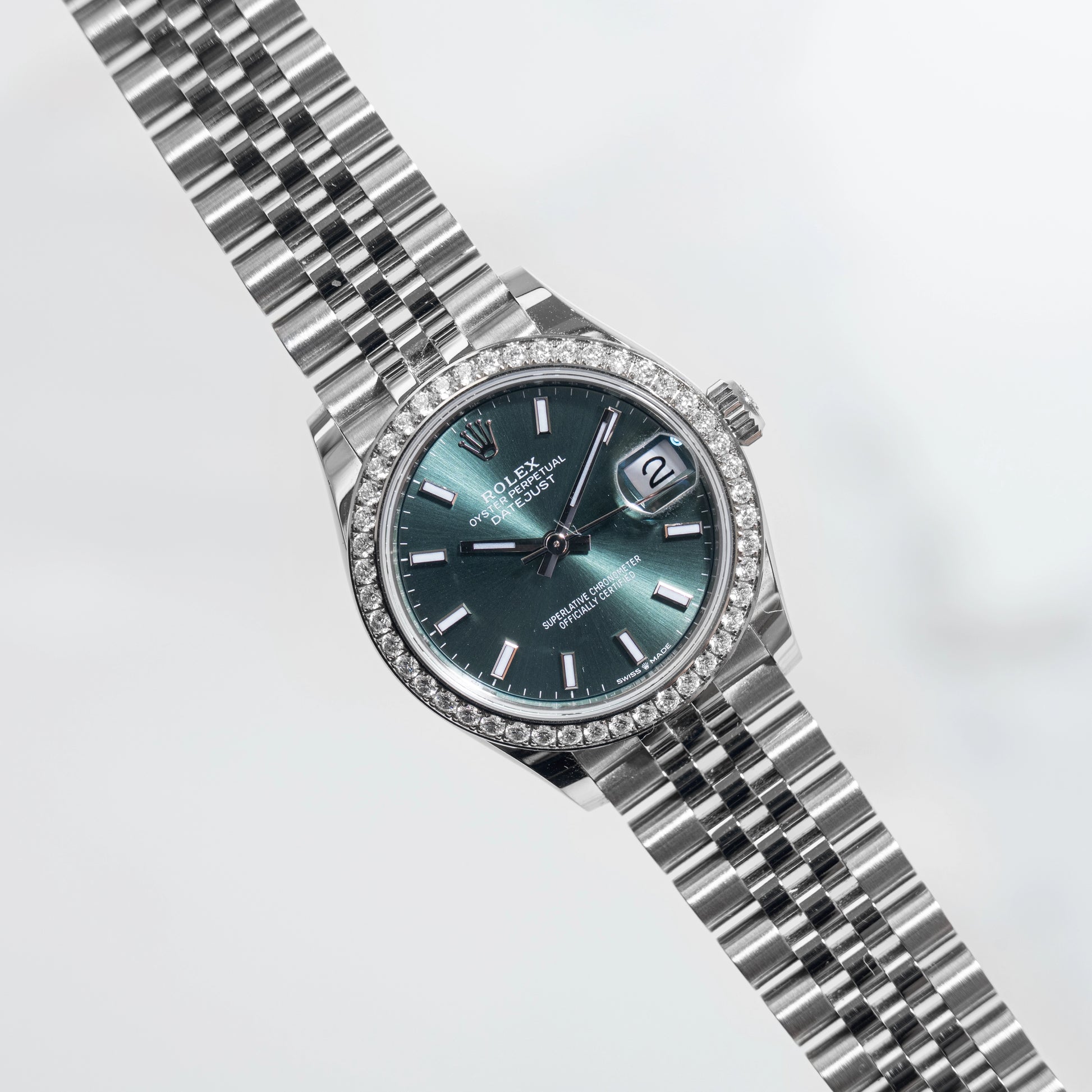 La collection Datejust incarne l’élégance intemporelle de la maison Rolex. La référence 278384RBR associe l’or blanc 18 k (White Rolesor) à une lunette entièrement sertie de diamants, dans un boîtier de 31 mm. Ce modèle s’adresse à celles qui recherchent une montre de luxe raffinée, confortable au poignet, et prête à porter.