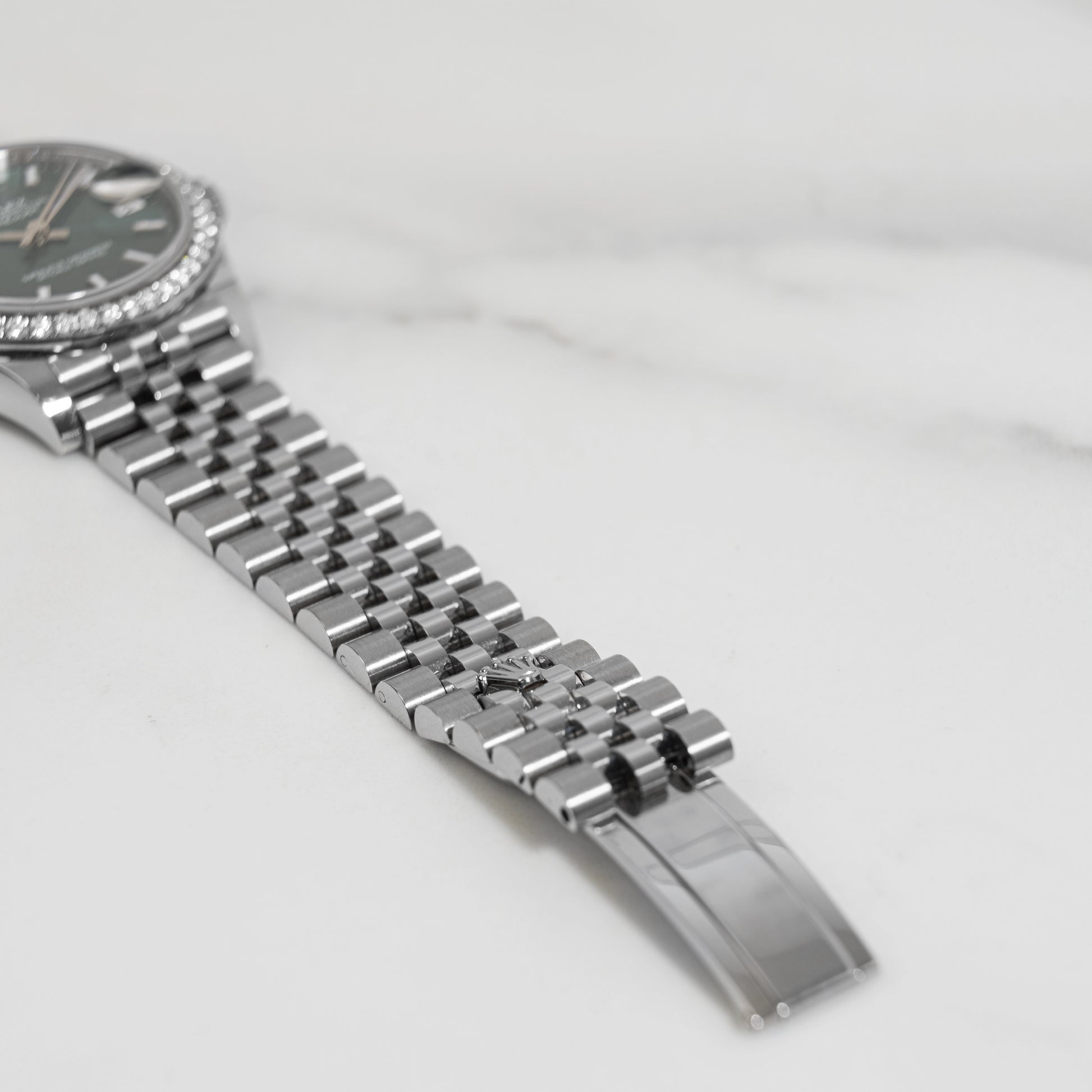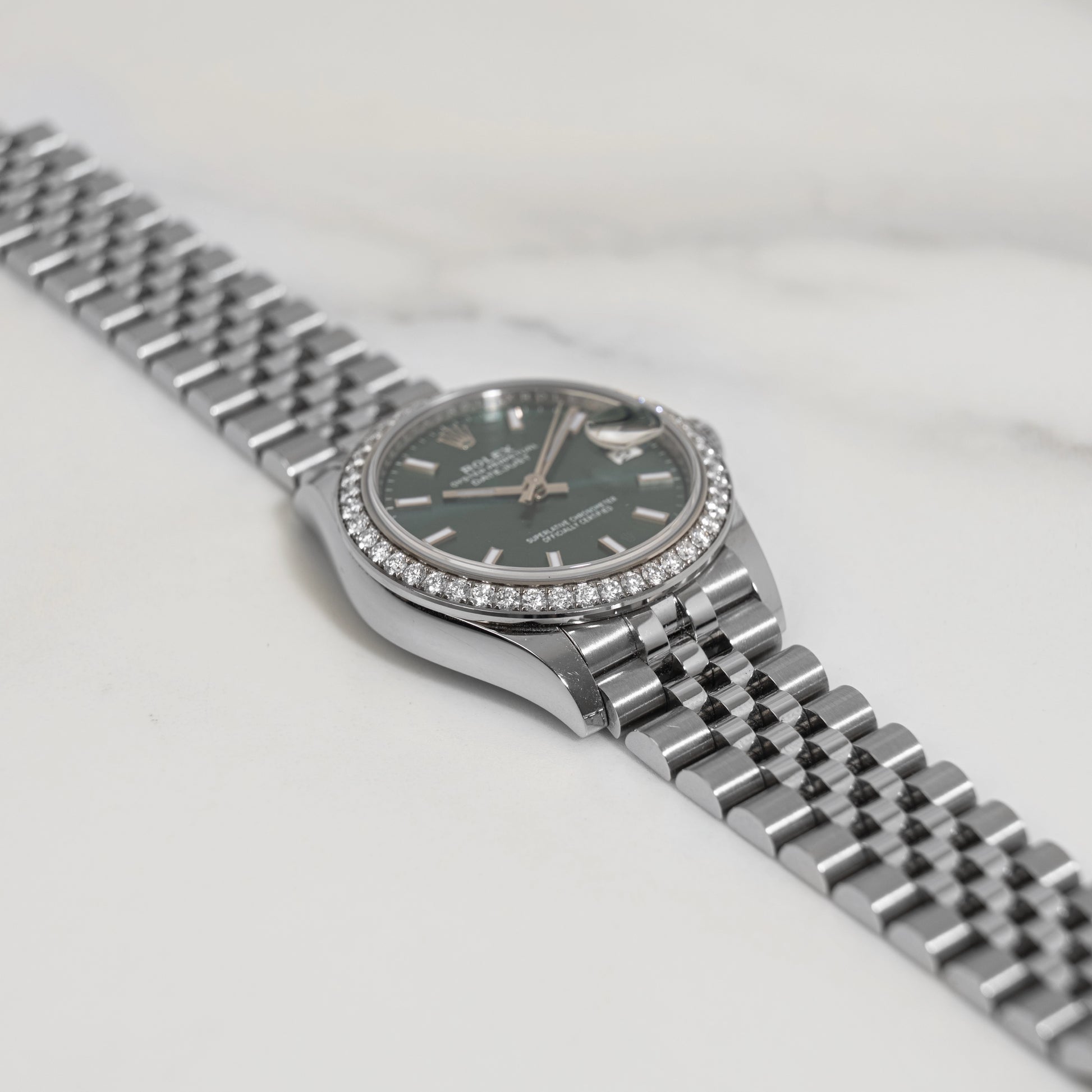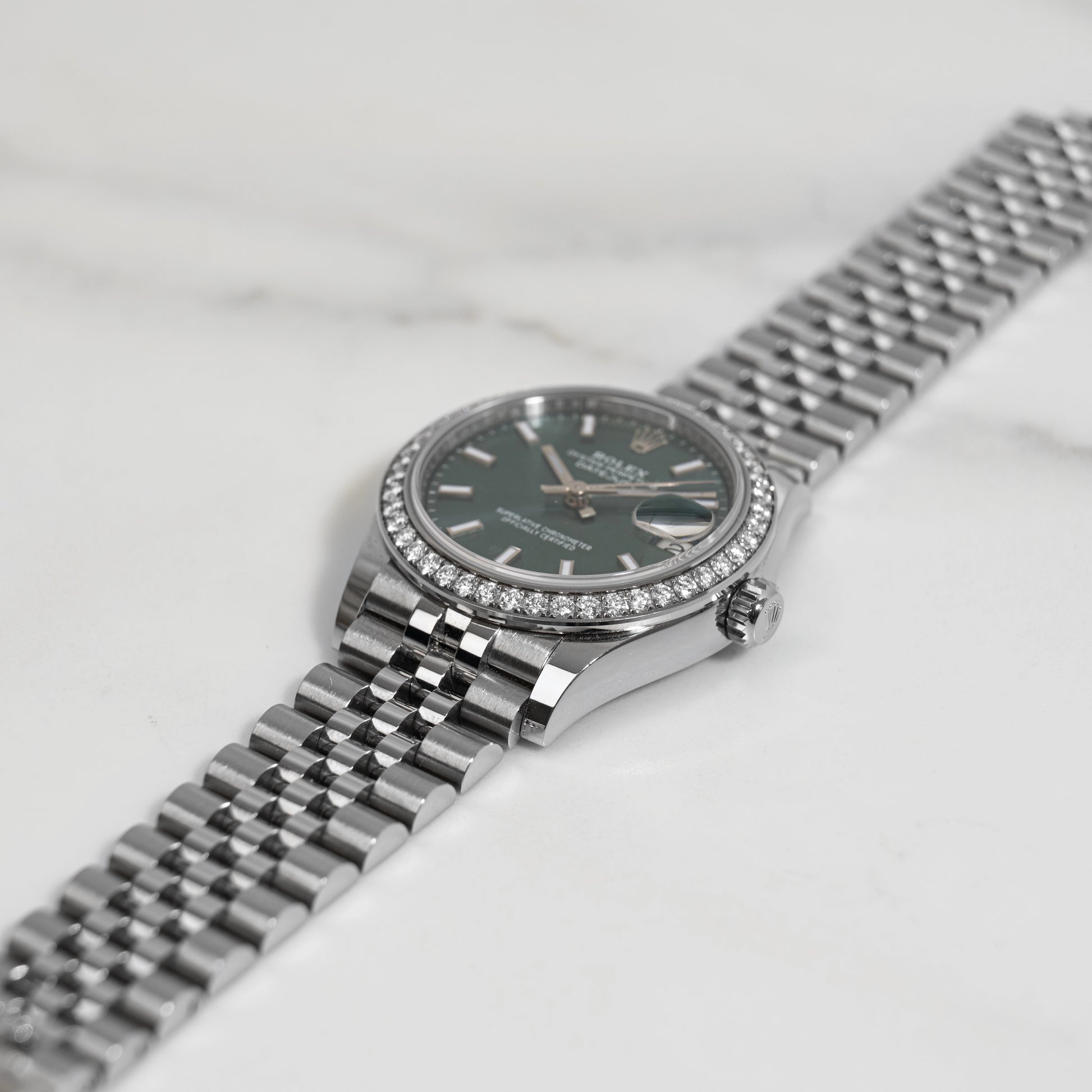 La collection Datejust incarne l’élégance intemporelle de la maison Rolex. La référence 278384RBR associe l’or blanc 18 k (White Rolesor) à une lunette entièrement sertie de diamants, dans un boîtier de 31 mm. Ce modèle s’adresse à celles qui recherchent une montre de luxe raffinée, confortable au poignet, et prête à porter.