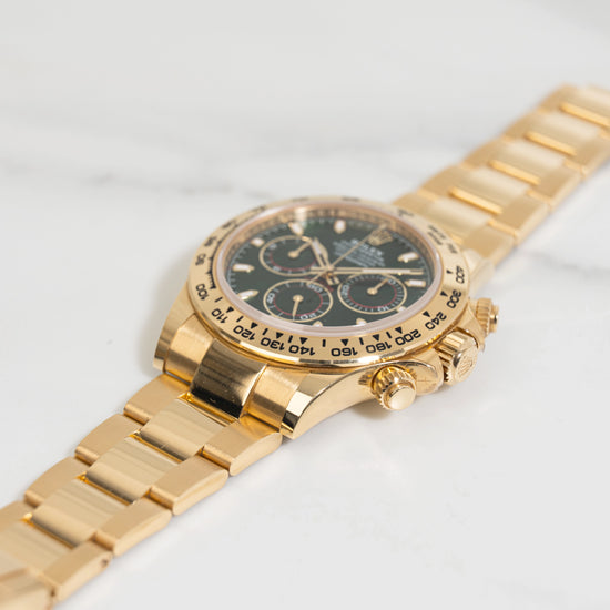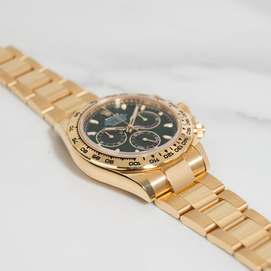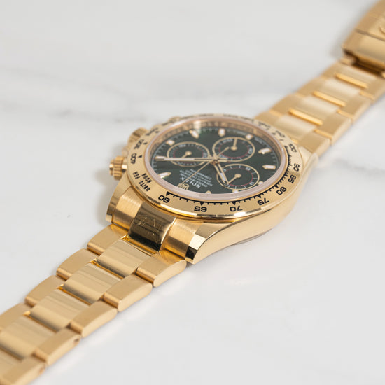 Cette Daytona 116508 full set de 2022 représente une opportunité rare d’acquérir une montre haut de gamme très désirée : or jaune massif, cadran vert distinctif, mouvement manufacture, et forte reconnaissance auprès des collectionneurs. C’est une pièce à la fois élégante et sportive, parfaite pour un port quotidien comme pour une collection.