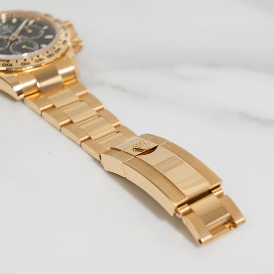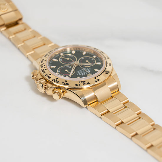 La Daytona 116508, en or jaune 18 k, est rapidement devenue une référence moderne majeure. Avec son cadran vert particulier, qui a été popularisé après que le collectionneur et musicien John Mayer lui ait donné une visibilité importante, ce modèle a acquis le surnom non officiel de « John Mayer Daytona ». Sa combinaison or jaune + cadran vert en fait un garde‑temps iconique dans l’univers Rolex contemporain.