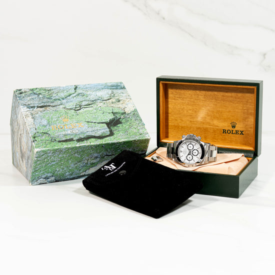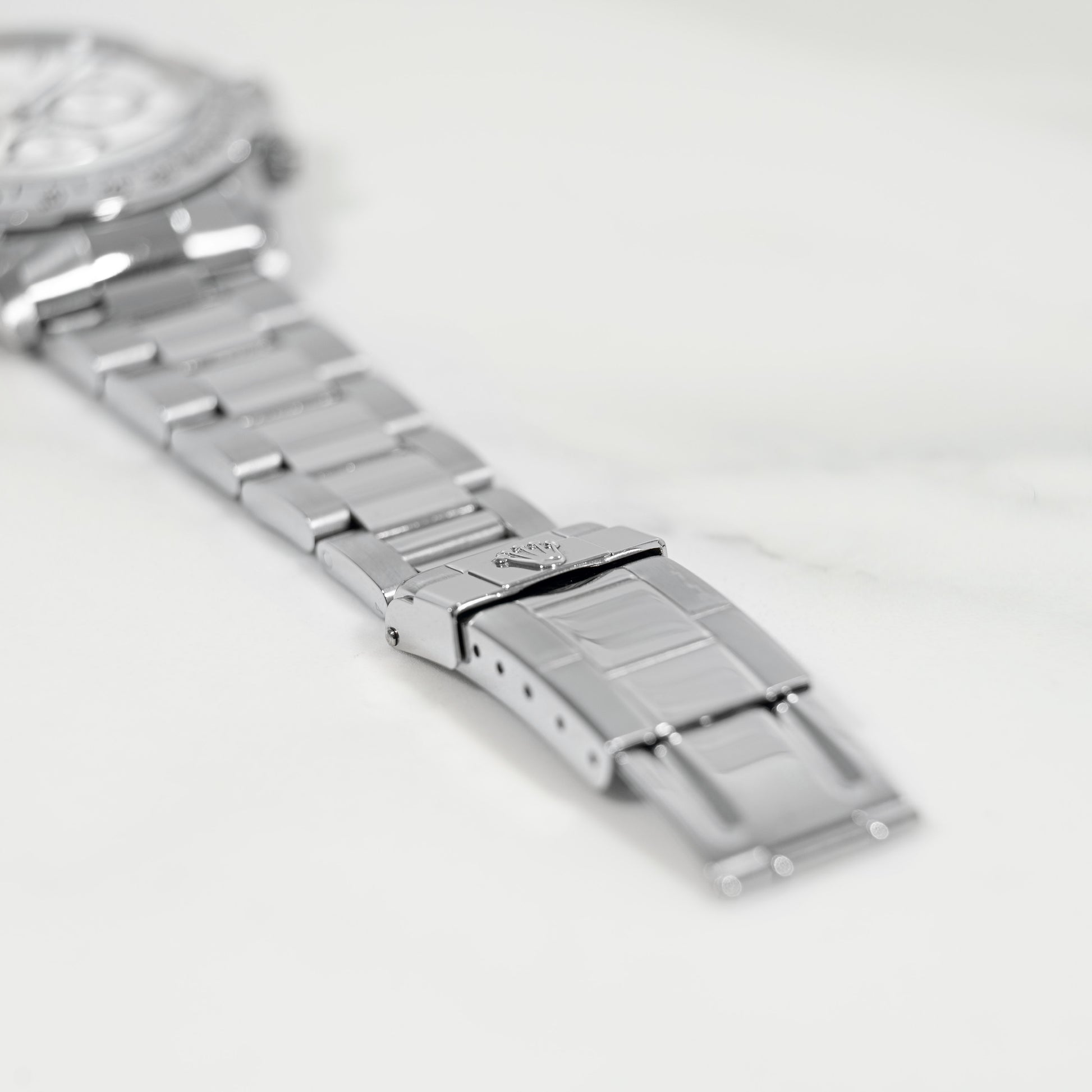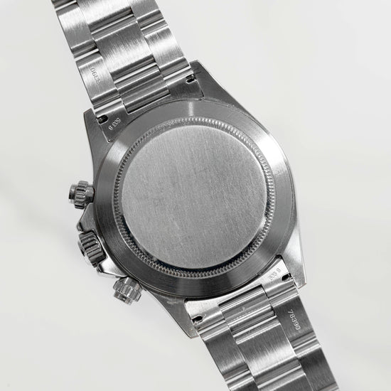 La Daytona réf. 16520 est la première génération de la Daytona automatique chez Rolex, avec boîtier de 40 mm, poussoirs vissés et calibre automatique basé sur le Zenith El Primero. Elle marque le passage d’une icône manuelle à une montre moderne, automatique, très recherchée par les collectionneurs.