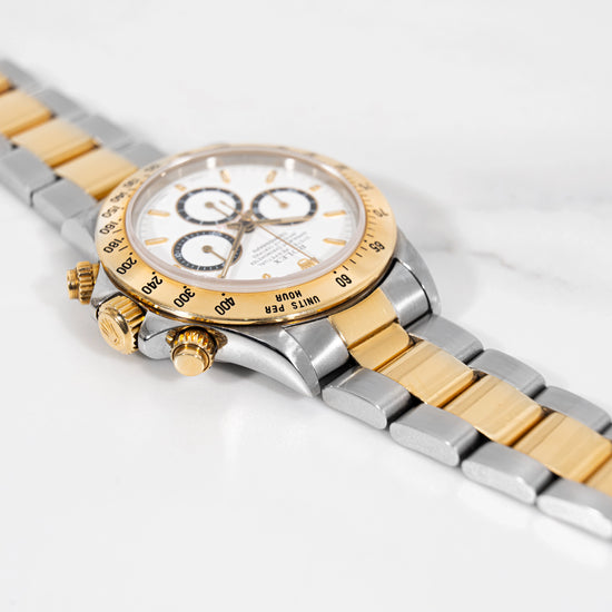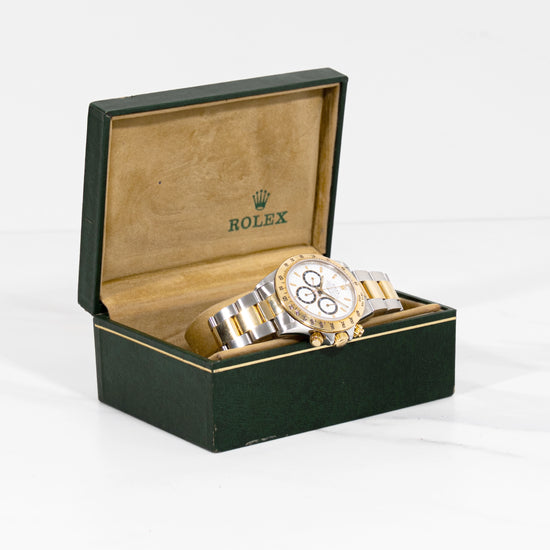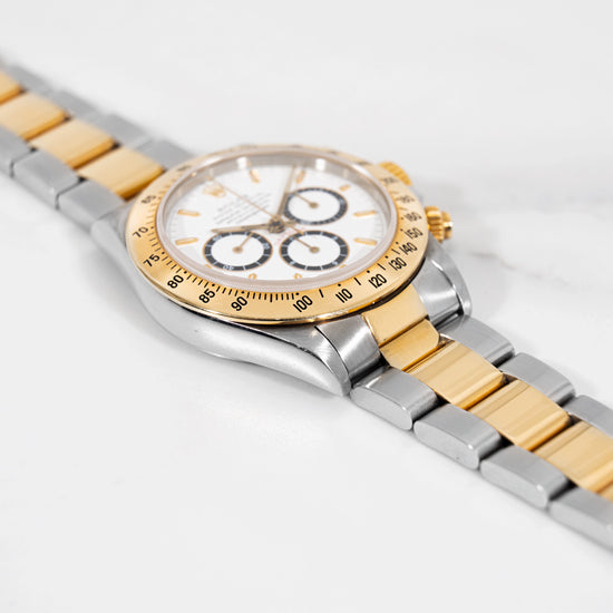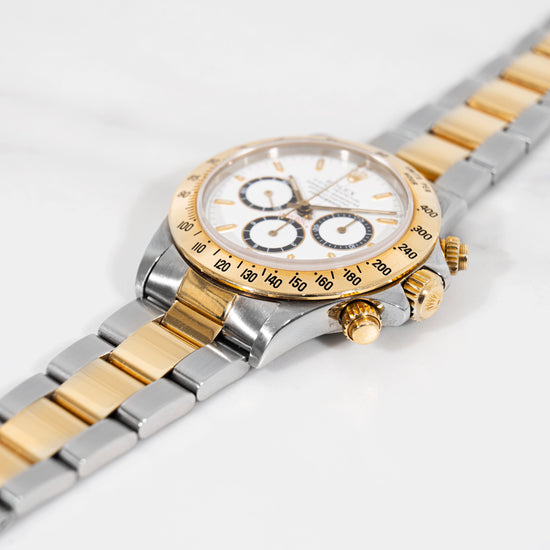 La Rolex Daytona 16523 marque un tournant dans l’histoire du chronographe de la marque. Introduite à la fin des années 1980, elle est animée par un mouvement basé sur le célèbre El Primero de Zenith (modifié par Rolex), faisant de cette référence l'une des plus iconiques de l’ère pré-automatique maison.