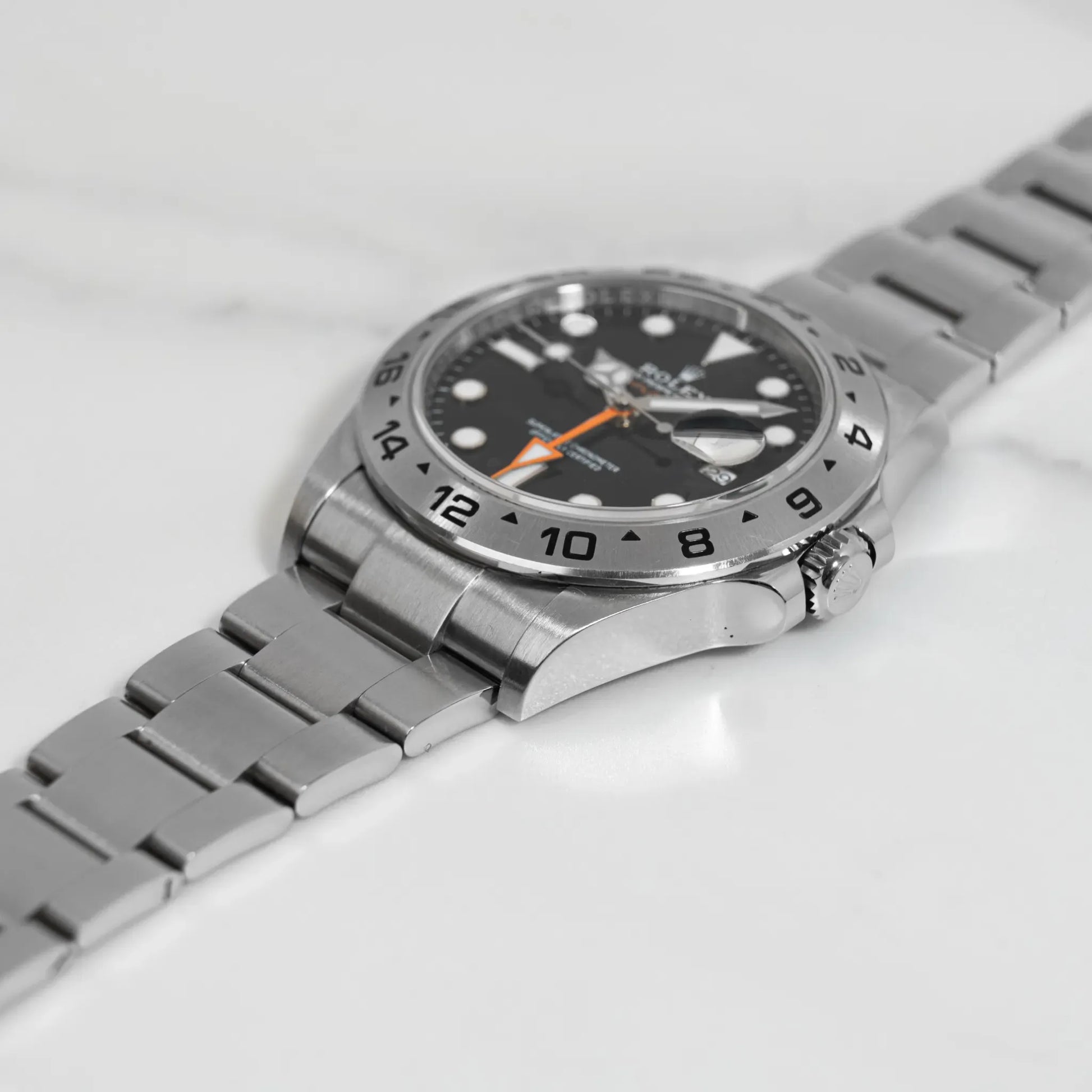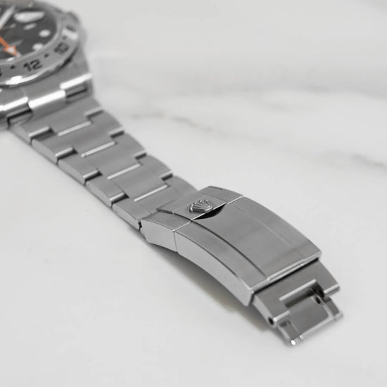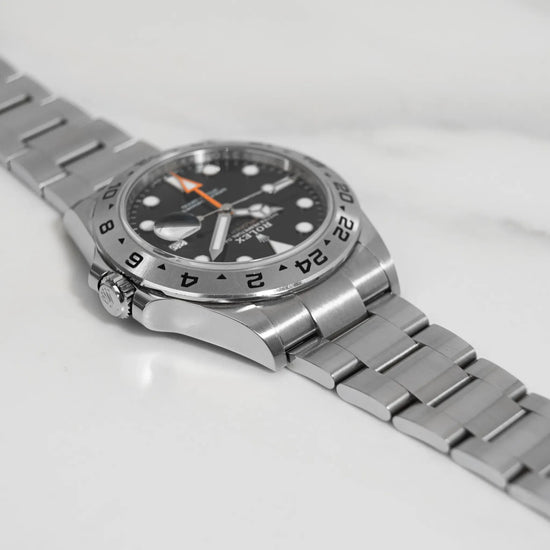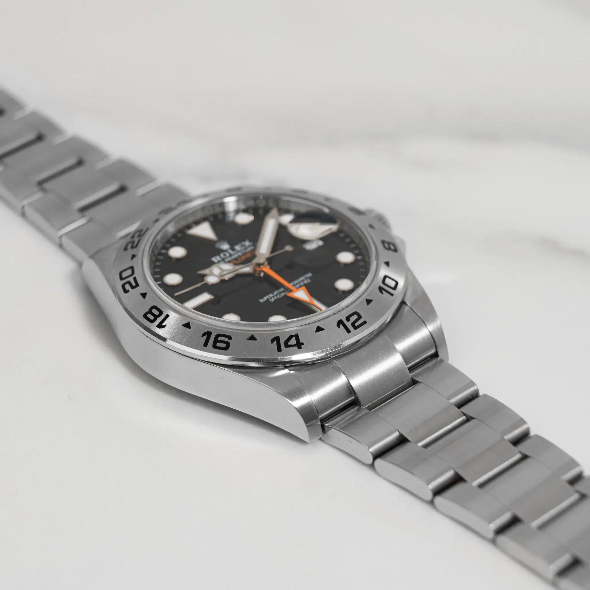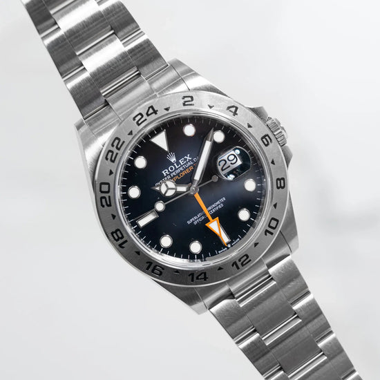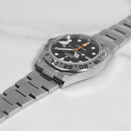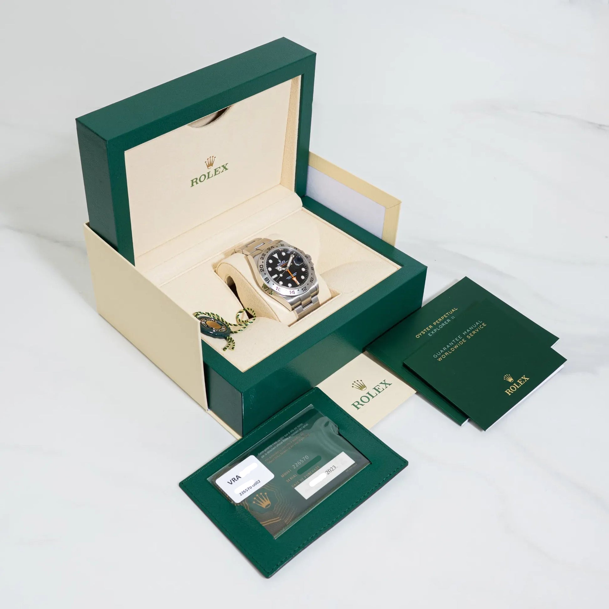 La Rolex Explorer II réf. 226570 est l’évolution moderne d’un modèle emblématique né pour l’aventure. Revisitée en 2021 pour les 50 ans de l’Explorer II, cette version conserve le diamètre de 42 mm et introduit le nouveau calibre 3285, avec une réserve de marche de 70 heures.