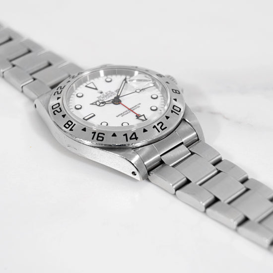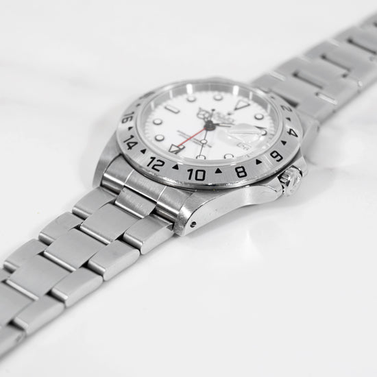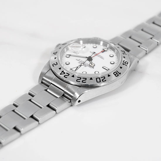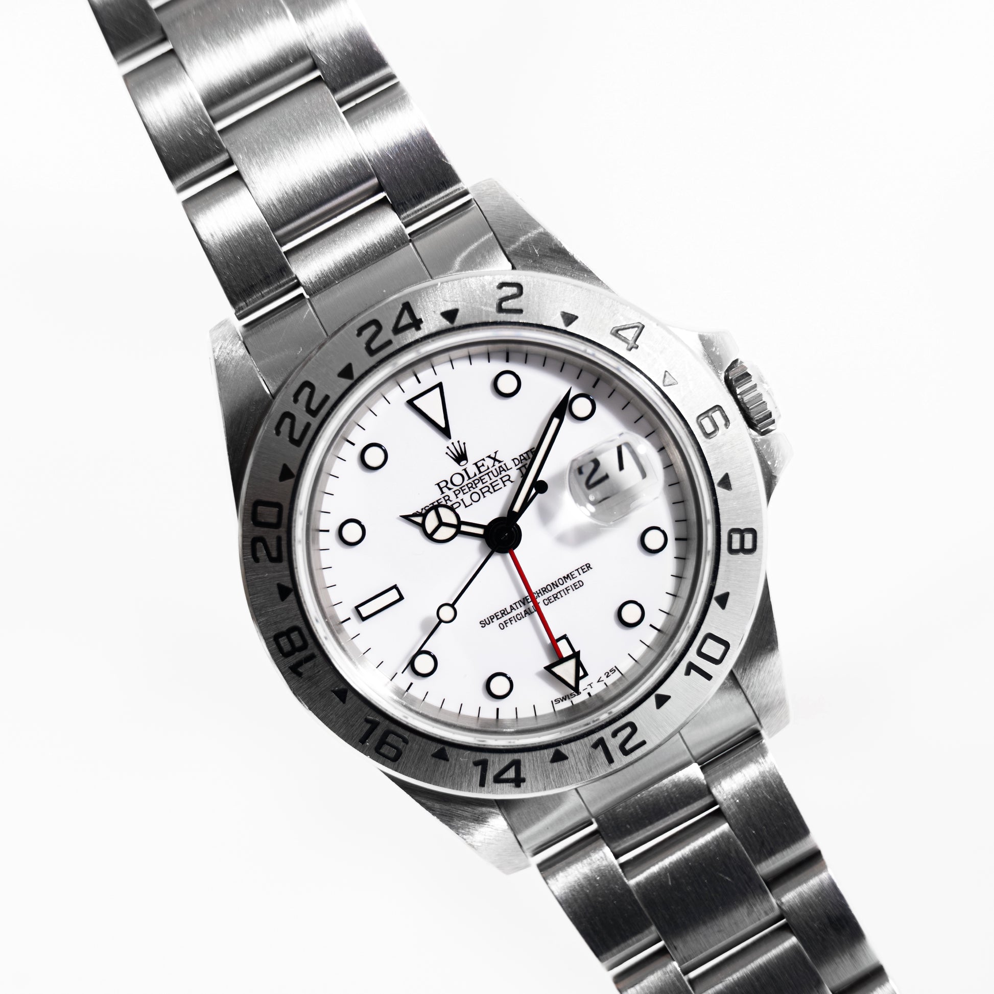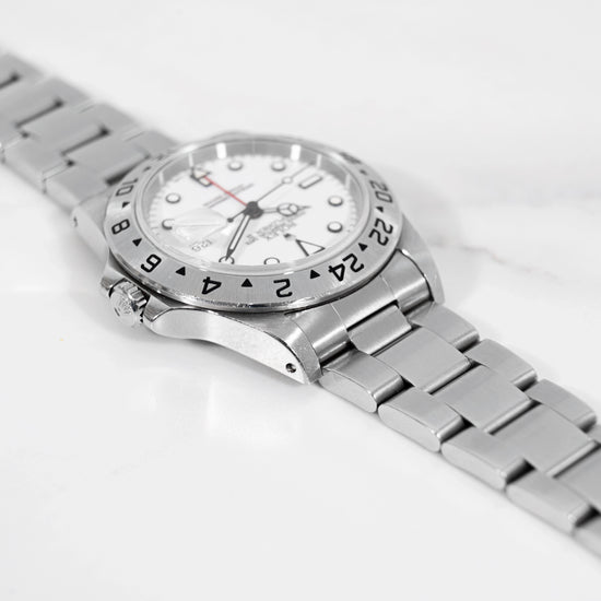 La Rolex Explorer II référence 16570, produite entre 1989 et 2007, est un modèle incontournable de chez Rolex. Elle intègre une aiguille 24 h permettant de suivre un second fuseau horaire, ce qui en faisait la montre de voyage idéale. La variante cadran blanc (souvent surnommée « Polar ») apporte une touche visuelle distincte et très appréciée.