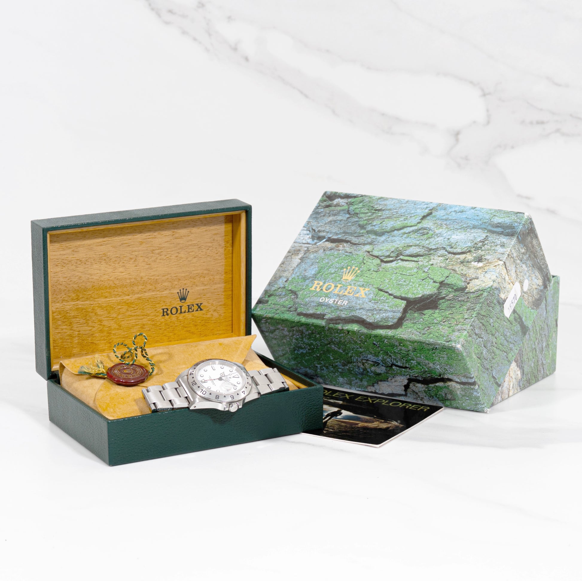 Cette Explorer II 16570 en cadran blanc de 1996 full set est une pièce particulièrement attrayante : design iconique, grande polyvalence, second fuseau horaire, et le charme du modèle vintage Rolex. Idéale pour un amateur de montres sportives de luxe, prête à porter ou à enrichir une collection.