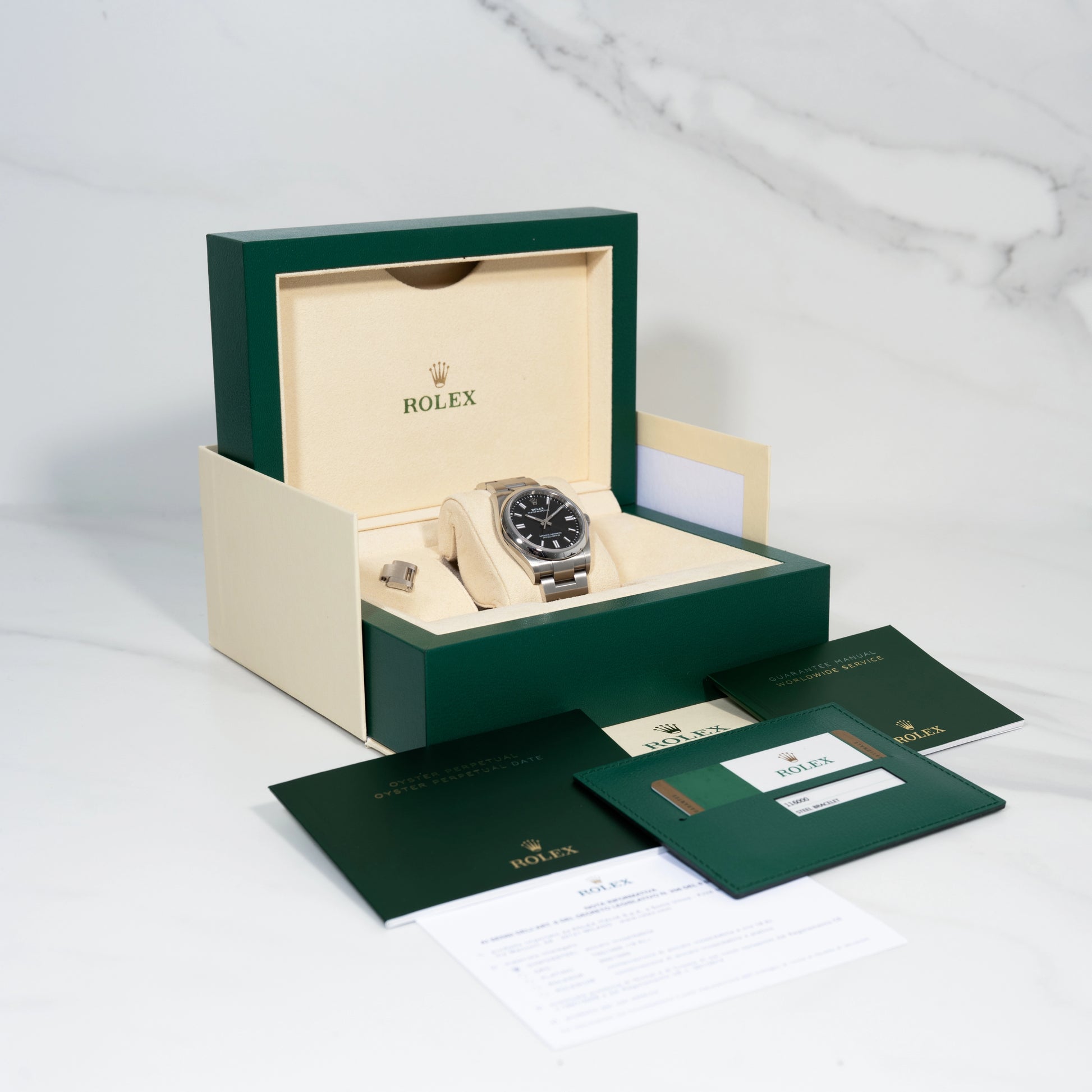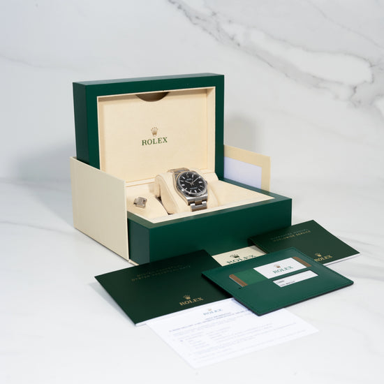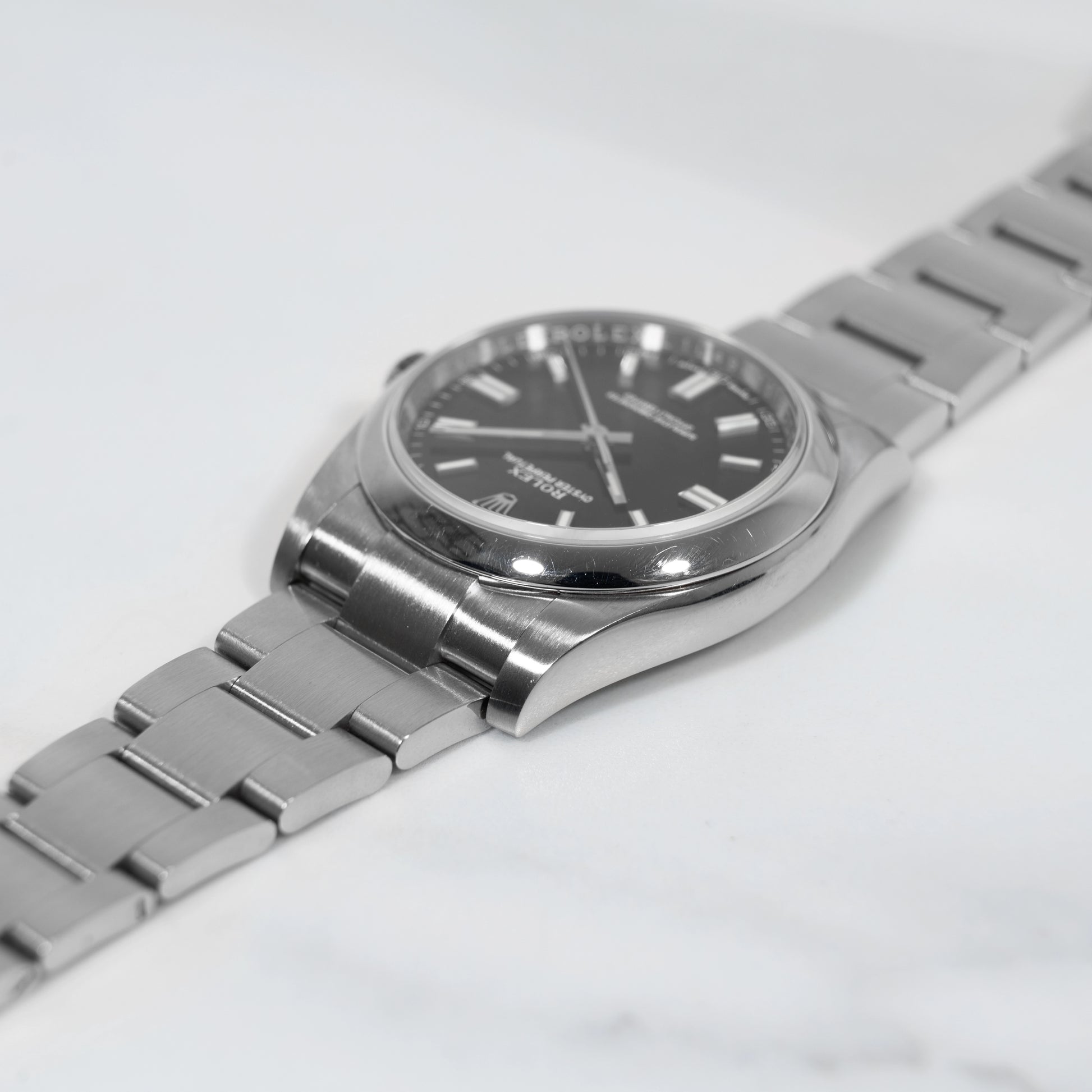 L’exemplaire présenté ici, dans sa configuration cadran noir avec index bâtons, affiche une esthétique sobre et élégante. Avec son full set daté de 2019, il s’agit d’un modèle particulièrement recherché, dernier millésime avant la sortie de la nouvelle génération 126000.