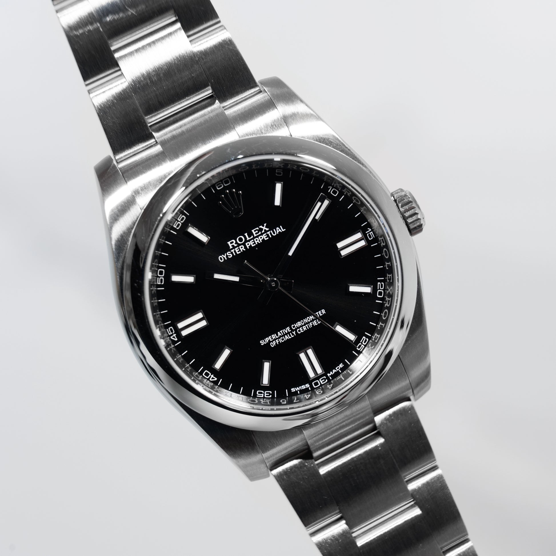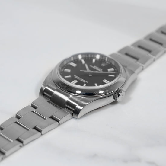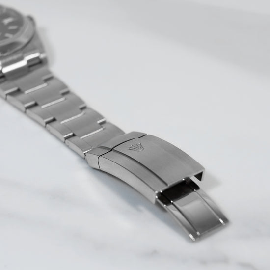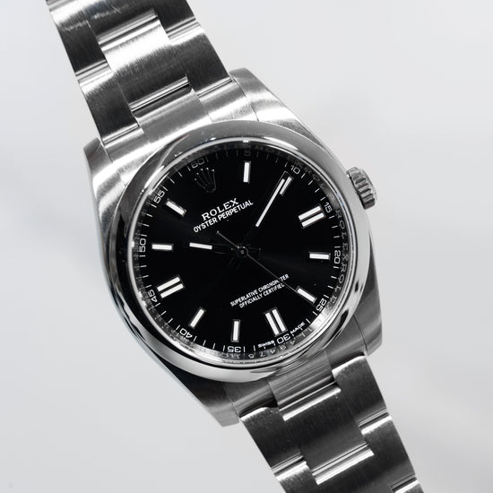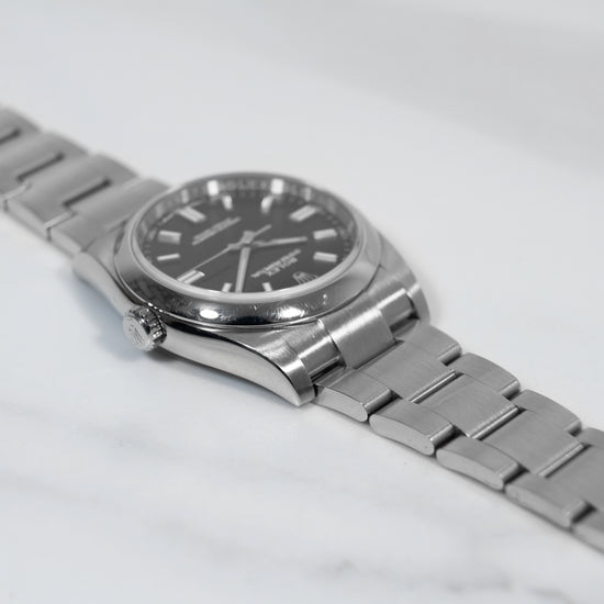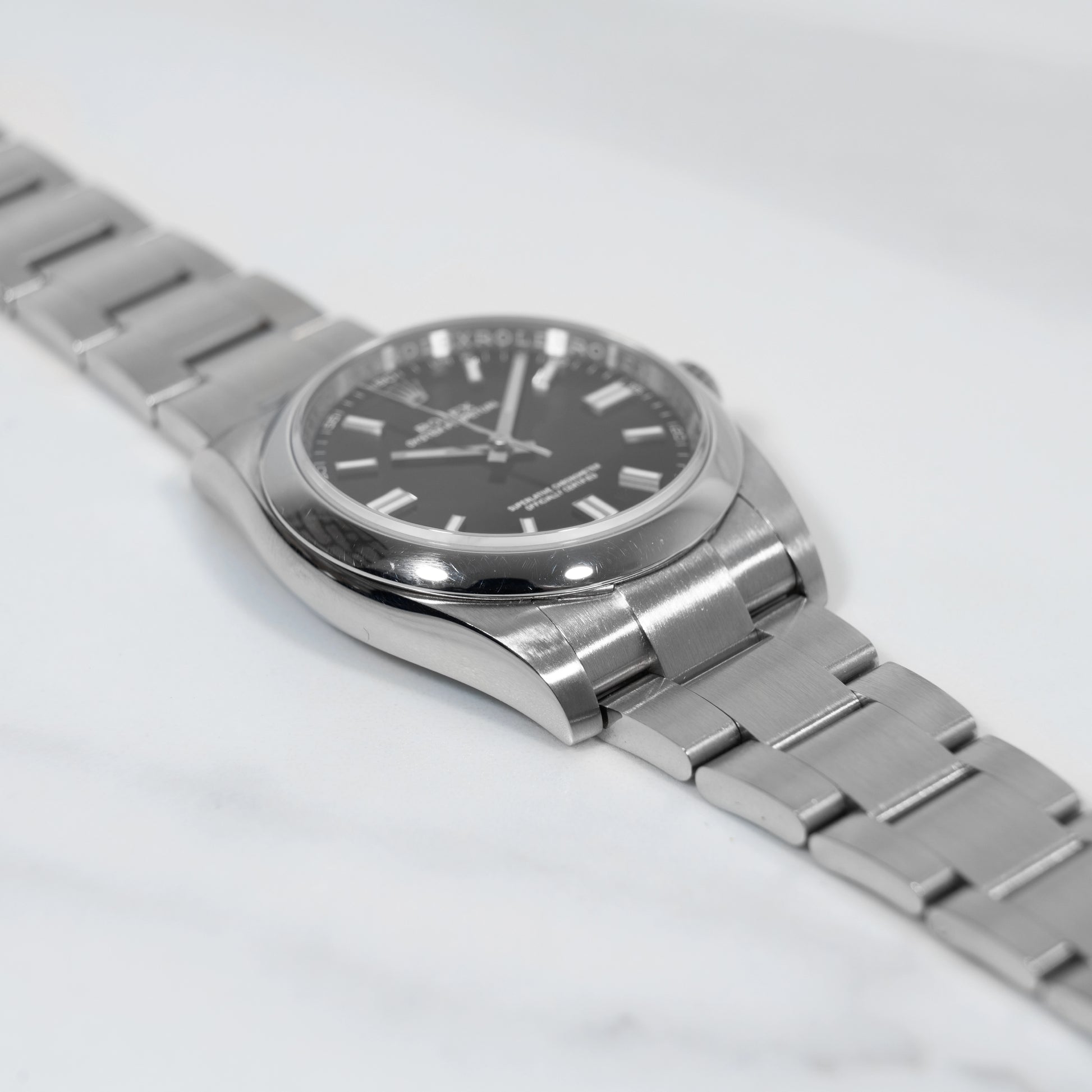 L’exemplaire présenté ici, dans sa configuration cadran noir avec index bâtons, affiche une esthétique sobre et élégante. Avec son full set daté de 2019, il s’agit d’un modèle particulièrement recherché, dernier millésime avant la sortie de la nouvelle génération 126000.
