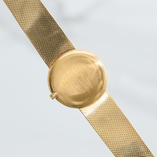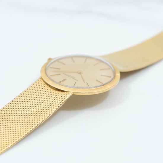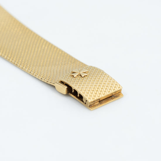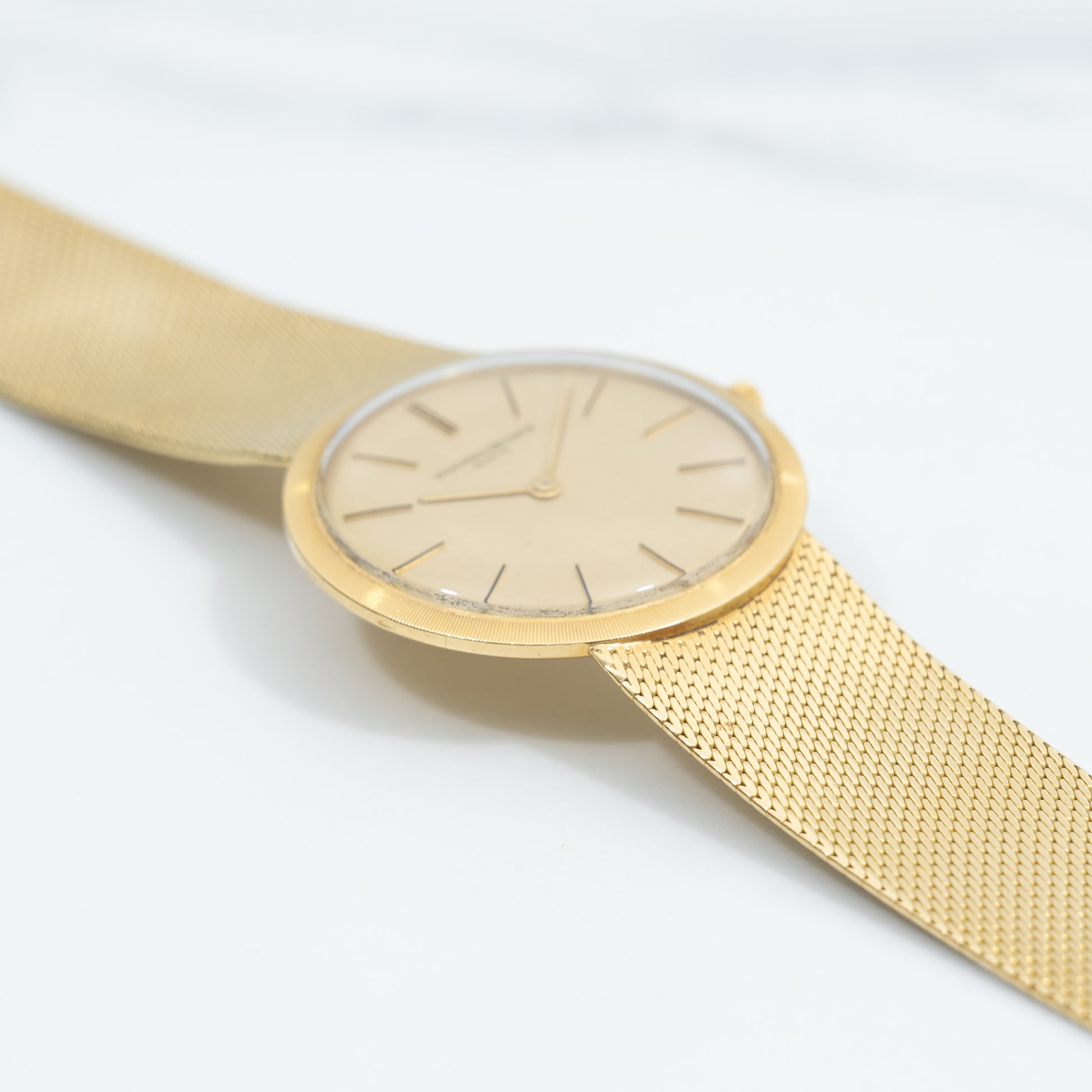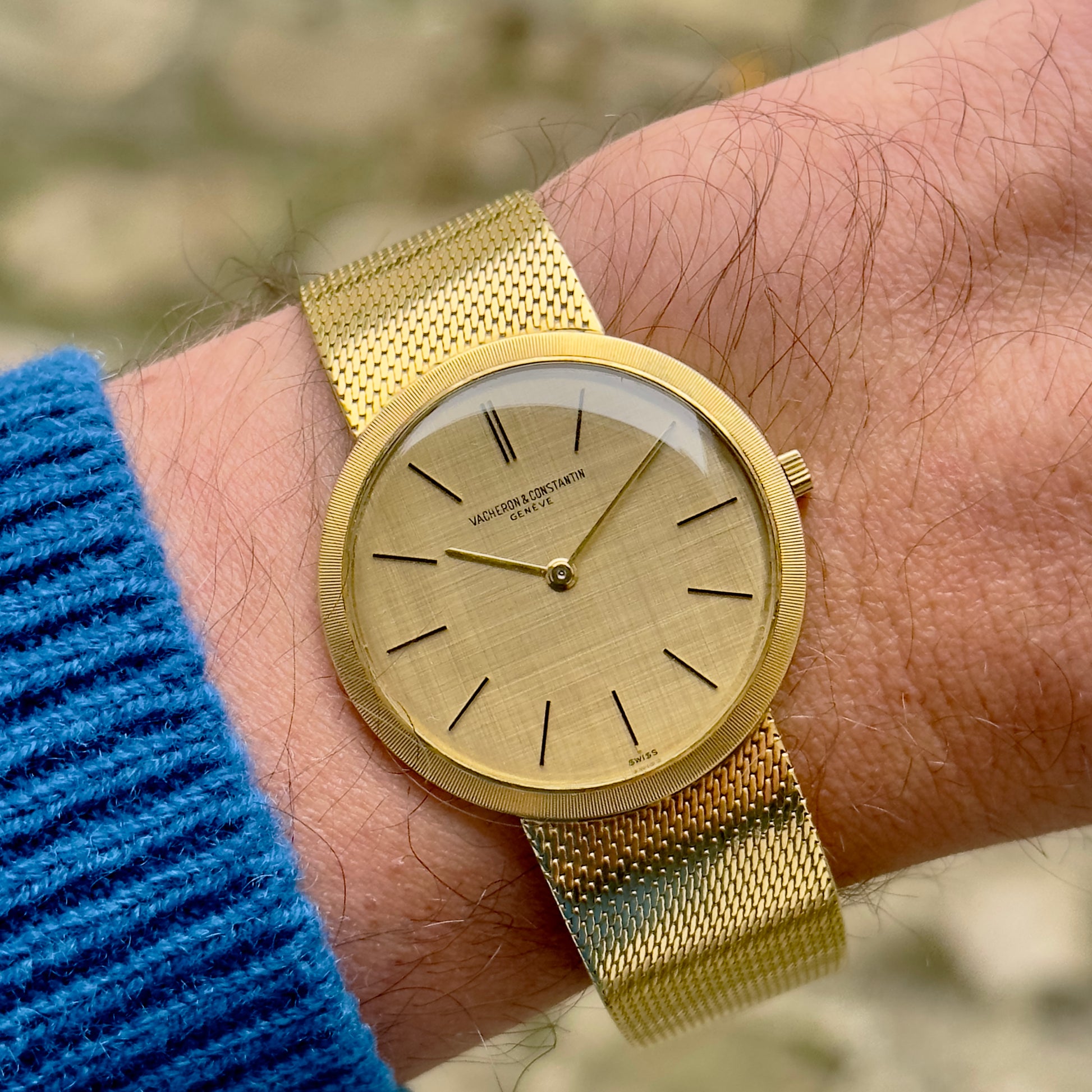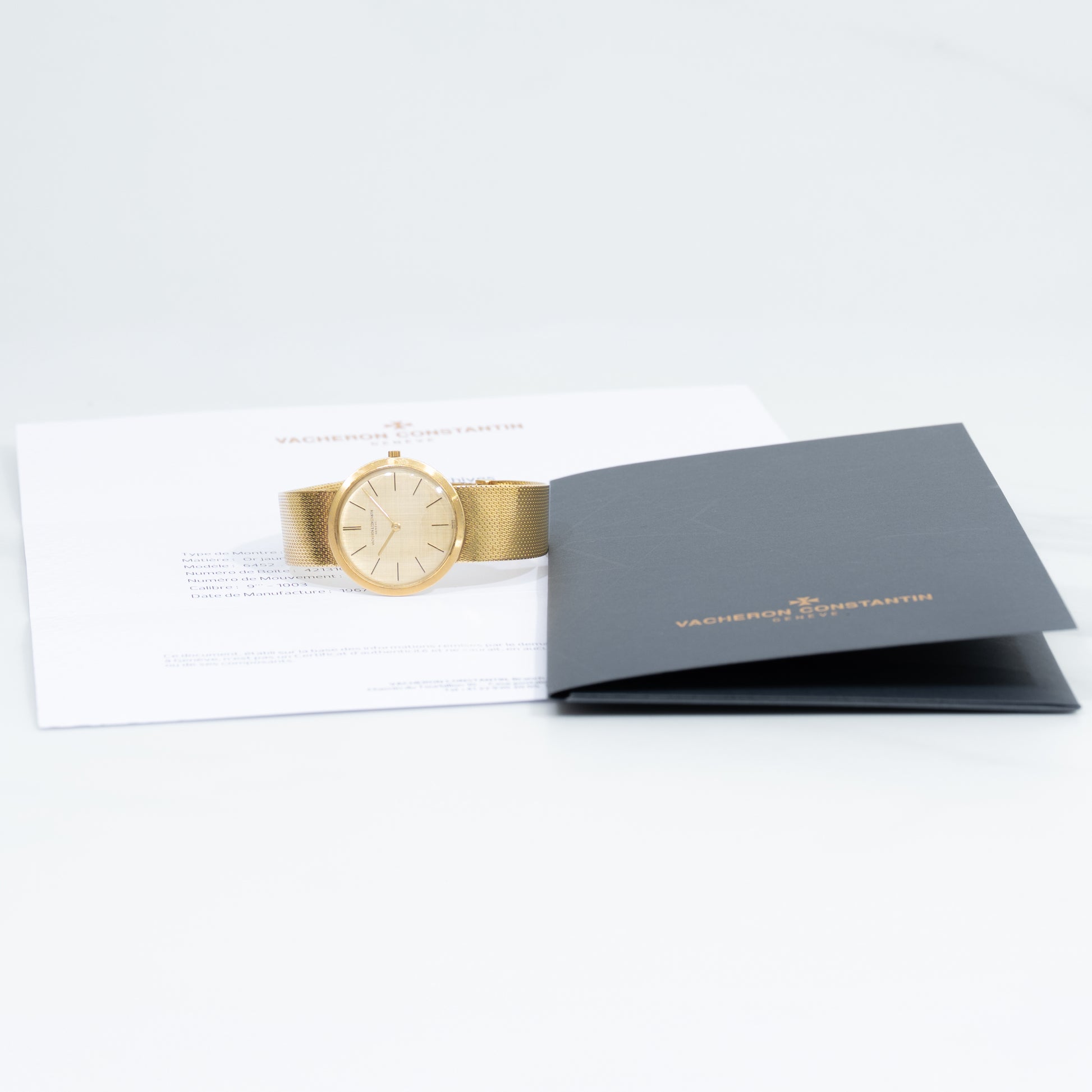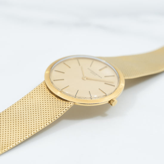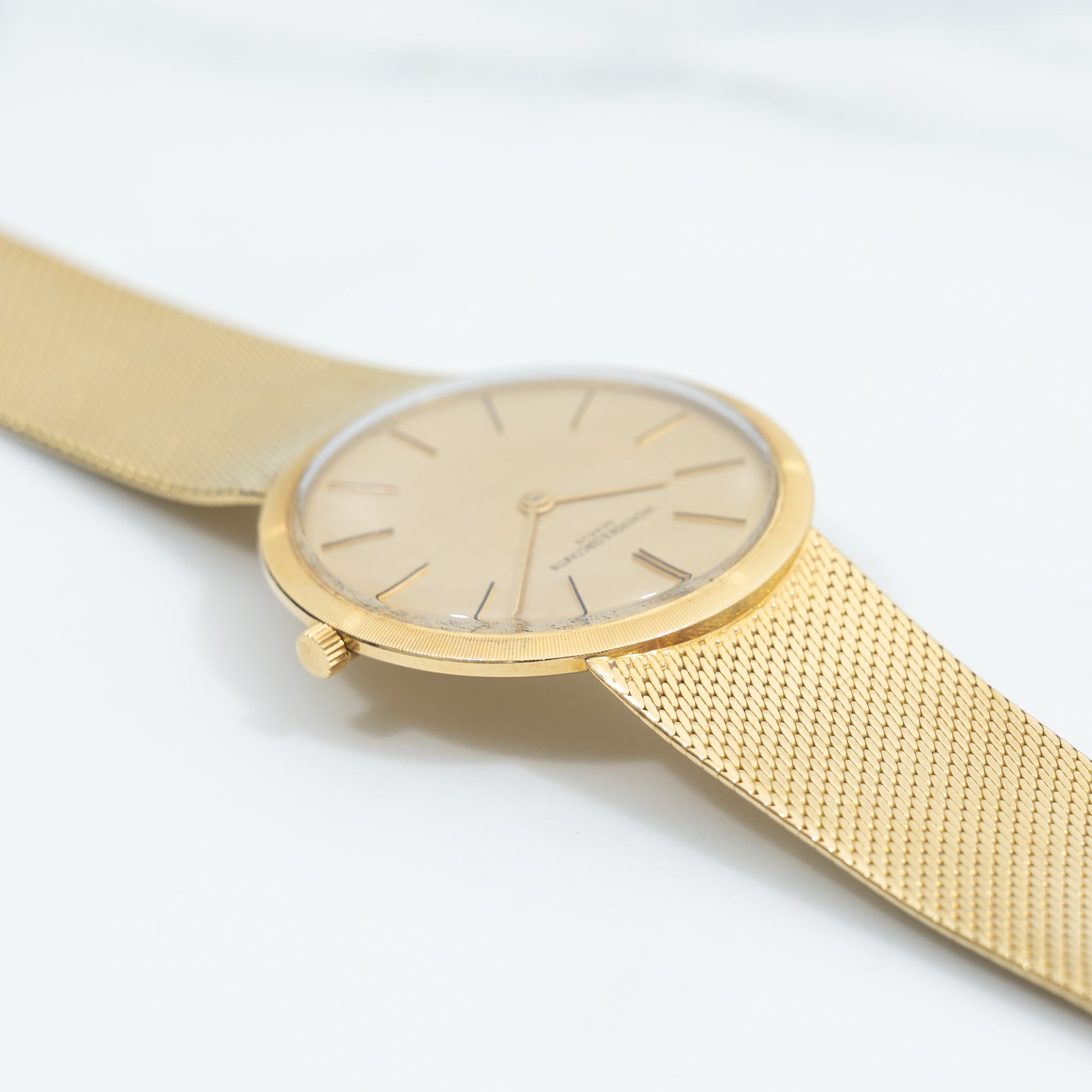 La référence 6452 de Vacheron Constantin, produite à la fin des années 60, incarne l'élégance pure de la montre habillée d’époque. Cette version en or jaune 18k se distingue par son bracelet intégré en maille milanaise, d’une finesse remarquable, jamais raccourci, avec son fermoir d’origine signé. À l’intérieur, on retrouve le calibre 1003, l’un des mouvements mécaniques les plus fins jamais produits par Vacheron, véritable chef-d’œuvre d’horlogerie. Le tout est complété par un magnifique cadran texturé "lin" et un extrait d’archives de la Maison confirmant son authenticité.